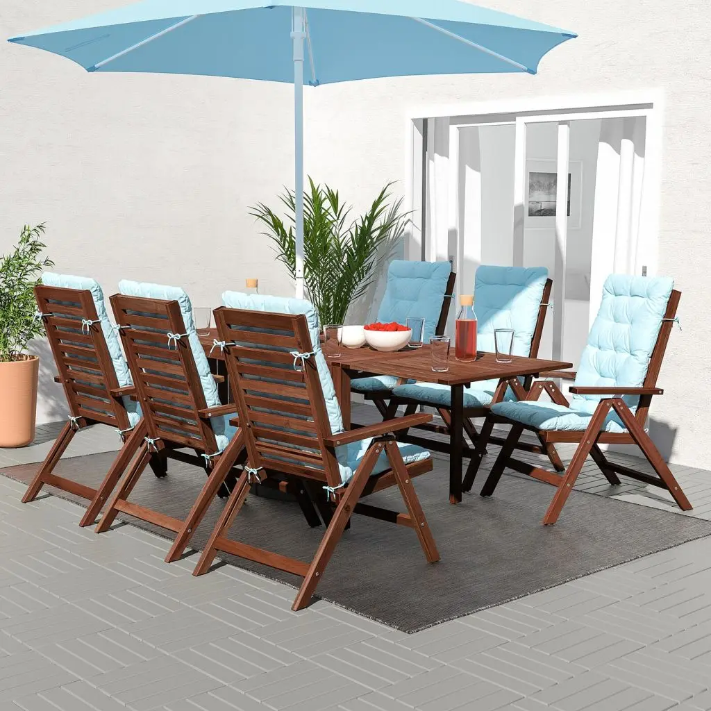 Откидные столешницы легко установить и убрать, что позволяет регулировать размер стола по необходимости.Отверстие в центре столешницы позволяет установить зонт от солнца.Спинку можно установить в одном из пяти положений.Мебель обработана полупрозрачной морилкой в несколько слоев. Это повышает ее прочность и подчеркивает выразительность натуральной фактуры дерева.Двустороннюю подушку можно переворачивать, это продлевает срок службы подушки.Стол (мин. длина 140 см, ср. длина 200 см, макс. длина 260 см, ширина 78 см, высота 72 см); стул (ширина 63 см, глубина 80 см, высота 101 см; ширина сиденья 44 см, глубина сиденья 48 см, высота сиденья 41 см).6 подушек прилагаются.Можно убирать на хранение в мешок или сундук серии ТОСТЕРО.Можно дополнить чехлом ТОСТЕРО для комплекта мебели 215×135 см.Рекомендовано для использования на улице.Дизайнер