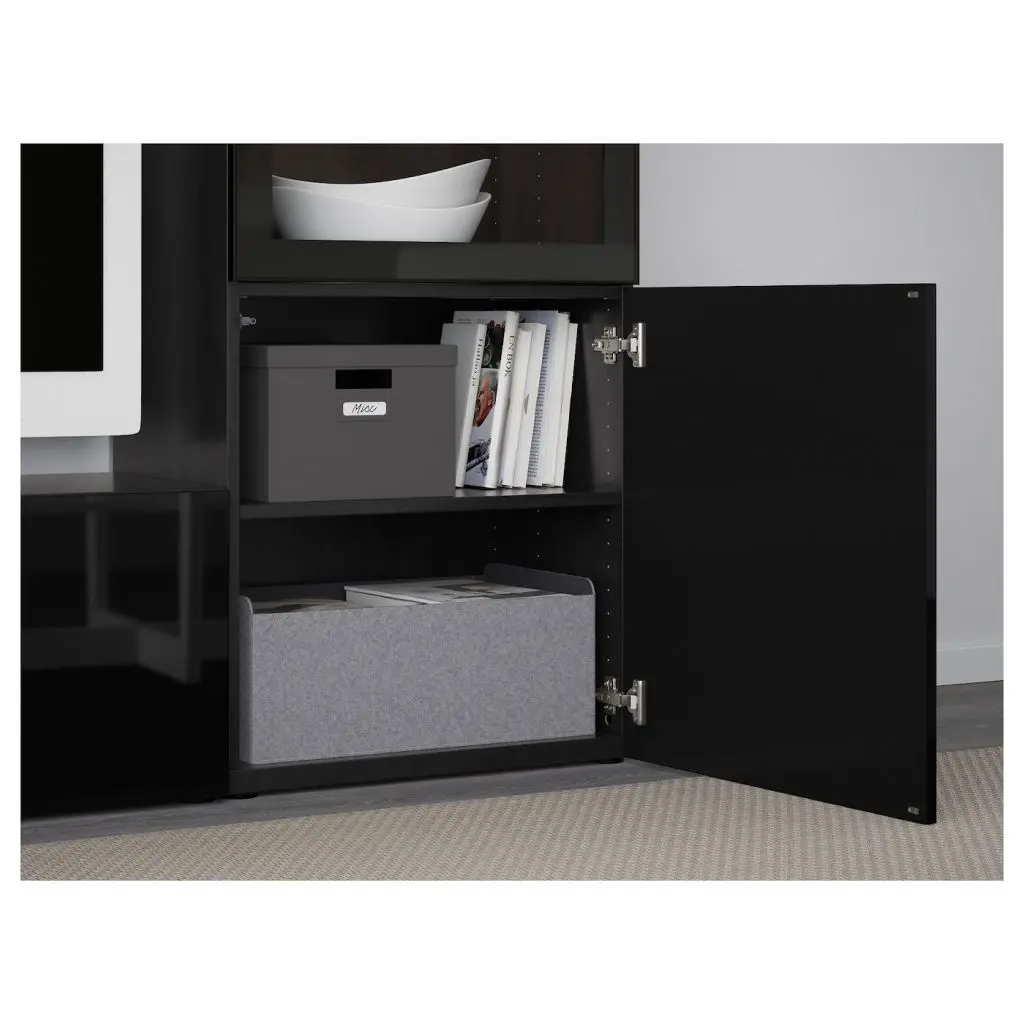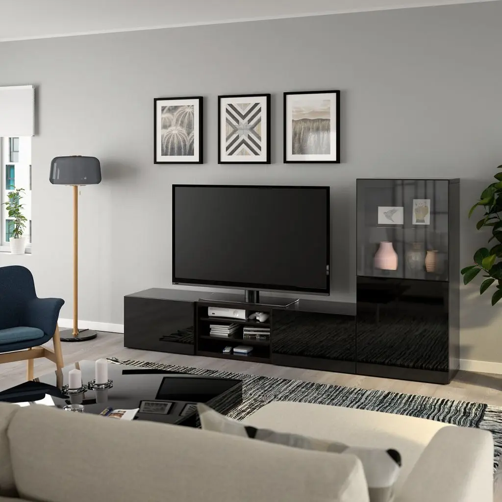 Благодаря доводчикам ящики закрываются плавно и бесшумно.Благодаря нескольким отверстиям на задней панели тумбы под ТВ провода от телевизора и других устройств всегда будут под рукой, но не на виду.Два ящика и полки за дверцами обеспечат достаточно места для хранения.Съемные полки позволяют регулировать пространство.Специальное отверстие в верхней панели обеспечит удобное и компактное размещение проводов.Эту мебель необходимо крепить к стене с помощью прилагаемого стенного крепежа.Будьте осторожны при обращении с закаленным стеклом! Из-за поврежденных краев и царапин на поверхности стекло может внезапно разбиться.Макс. нагрузка на верхнюю панель этой тумбы под ТВ: 50 кг.Для разных стен требуются различные крепежные приспособления. Подберите подходящие для ваших стен шурупы, дюбели, саморезы и т. п. (не прилагаются).Максимальная нагрузка на закрепленный на стене модуль зависит от материала стены.Внутренние элементы для организации хранения в модулях БЕСТО продаются отдельно.Если вы выберете функцию плавного закрывания, рекомендуем дополнить фасады ручками, чтобы открывать ящики/шкафы было удобнее.Дизайнер
