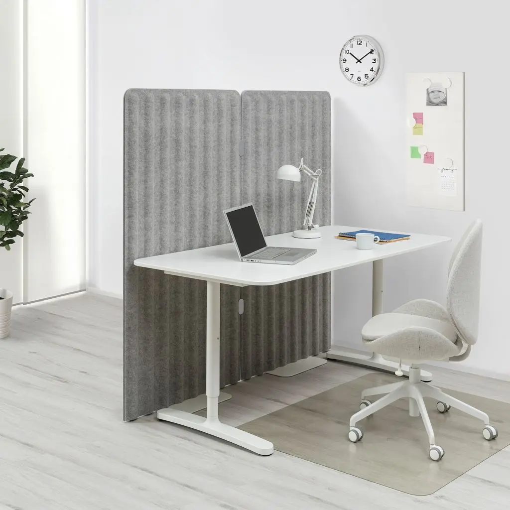 Бесплатно 10 лет гарантии. Подробнее об условиях гарантии – в гарантийной брошюре.Глубокая столешница обеспечивает просторную рабочую поверхность и комфортное расстояние до монитора компьютера.Прочная меламиновая поверхность устойчива к загрязнению и проста в уходе.Высота ножек регулируется от 65 до 85 см. Расположите столешницу на удобной для вас высоте.Экран помогает создать приятную спокойную атмосферу на рабочем месте, поглощая шум и огораживая личное пространство.Используя как доску для записей, бумагу можно закреплять с помощью кнопок.Стоит на полу, не нужно крепить к столешнице.Дизайнер
