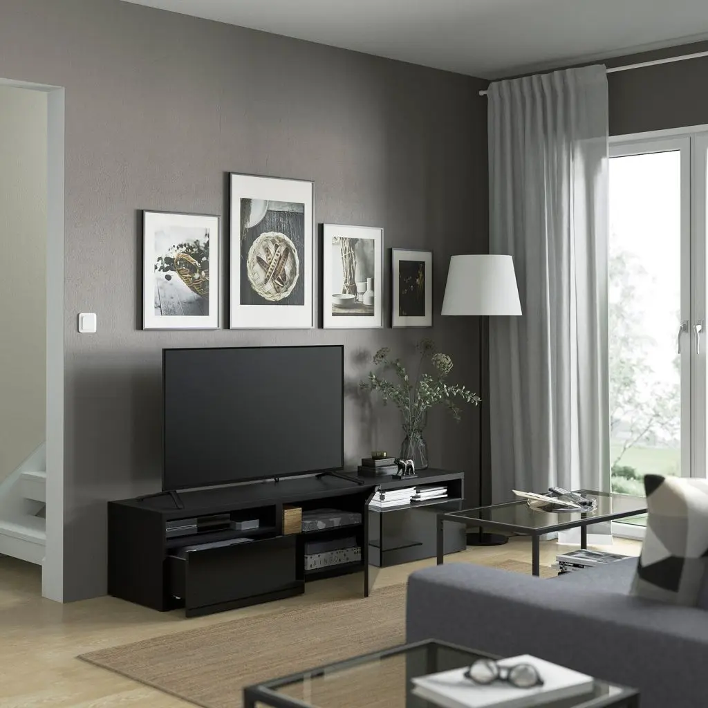 Благодаря интегрированному нажимному механизму ящик открывается легким нажатием.Направляющие ящика регулируются, позволяя изменять положение фронтальной панели как в горизонтальной плоскости, так и по глубине.Благодаря нескольким отверстиям на задней панели тумбы под ТВ провода от телевизора и других устройств всегда будут под рукой, но не на виду.Два ящика обеспечат порядок в хранении пультов, игровых приставок и других аксессуаров для ТВ.Регулируемые ножки обеспечивают устойчивость тумбы под ТВ даже на неровном полу.Организуйте и оптимизируйте систему для хранения БЕСТО, используя подходящие коробки и вставки.Тумбу под ТВ необходимо крепить к стене с помощью прилагающегося стенного крепежа.Мы рекомендуем, чтобы тумба была немного шире, чем установленный на ней телевизор. Эта тумба подходит для телевизора до 72 дюймов. Вы можете выбрать телевизор большего размера, если он не тяжелее указанной максимальной нагрузки на верхнюю панель тумбы.Верхняя панель этой тумбы предназначена для телевизора весом макс. 50 кг.Максимальная нагрузка на закрепленный на стене модуль зависит от материала стены.Для разных стен требуются различные крепежные приспособления. Подберите подходящие для ваших стен шурупы, дюбели, саморезы и т. п. (не прилагаются).Для функционирования нажимного механизма необходимо пространство между каркасом и фронтальной панелью ящика, чтобы ящик открывался нажатием. Небольшой зазор необходим для обеспечения этой функции и не является недостатком товара.
