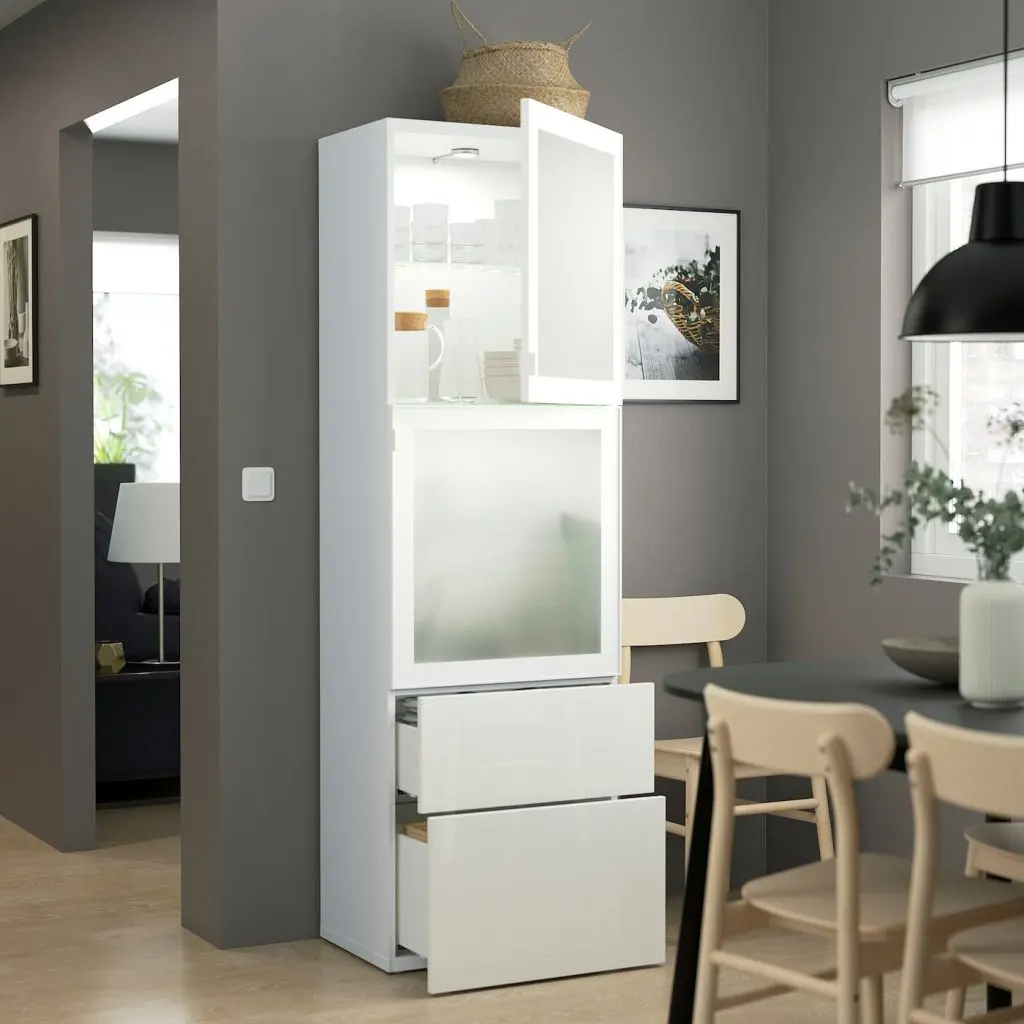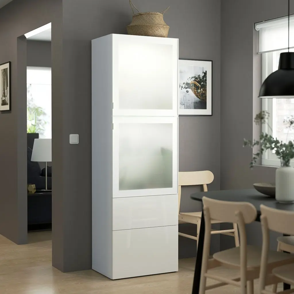 Ящики со встроенным нажимным механизмом открываются легким нажатием.Стеклянные дверцы обеспечивают обзор содержимого, защищая его от пыли.Конструкция петель позволяет отрегулировать и выровнять дверцу по вертикали и по горизонтали. Съемные стеклянные полки позволяют регулировать пространство.Два ящика и полки за дверцами обеспечат достаточно места для хранения.Эту мебель необходимо крепить к стене с помощью прилагаемого стенного крепежа.Будьте осторожны при обращении с закаленным стеклом! Из-за поврежденных краев и царапин на поверхности стекло может внезапно разбиться.Для разных стен требуются различные крепежные приспособления. Подберите подходящие для ваших стен шурупы, дюбели, саморезы и т. п. (не прилагаются).Для функционирования нажимного механизма необходимо пространство между каркасом и фронтальной панелью ящика, чтобы ящик открывался нажатием. Небольшой зазор необходим для обеспечения этой функции и не является недостатком товара.Чтобы создать единый интерьер во всем доме, фасады СЕЛЬСВИКЕН можно комбинировать с подходящими дверями ФАРДАЛЬ для гардероба ПАКС.