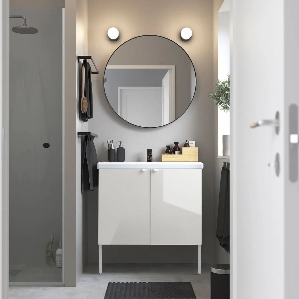 Серия ФИСКОН позволяет с легкостью создавать комбинации мебели, чтобы обновить интерьер ванной. В этом напольном шкафу под раковину с полкой поместятся полотенца и туалетная бумага, а белая глянцевая дверца сделает решение ярче.