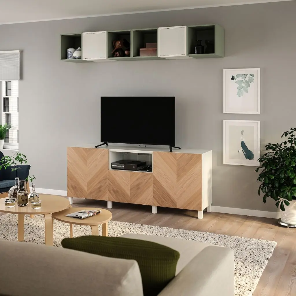 Тумба для телевизора БЕСТО может использоваться для телевизора и всех необходимых гаджетов. Открытые полки продемонстрируют ваши любимые вещи, а в закрытых вы сможете спрятать то, что хотите скрыть от посторонних глаз.
