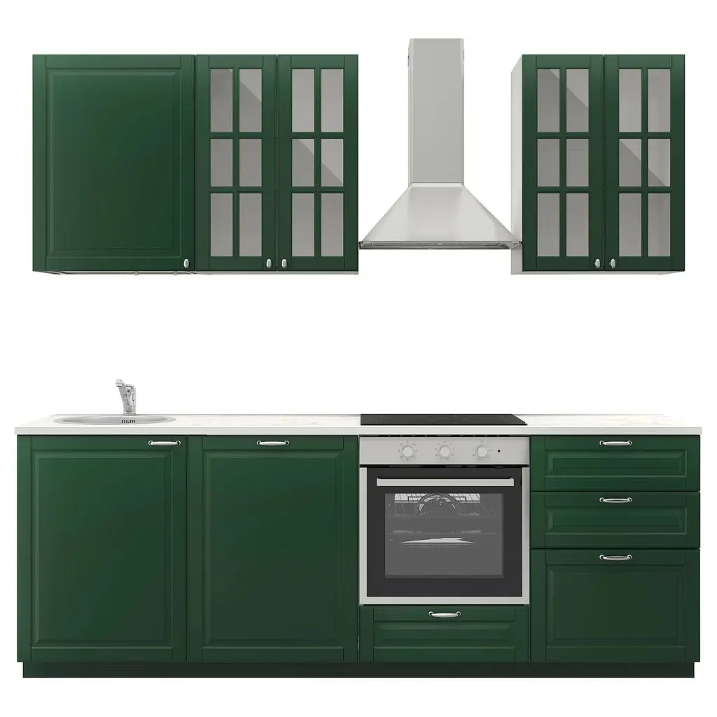 В комплект входит: мойка, смеситель, выпуск, шкафы, ящики, дверцы, столешница, ножки, цоколи, полки, петли и крепления.
