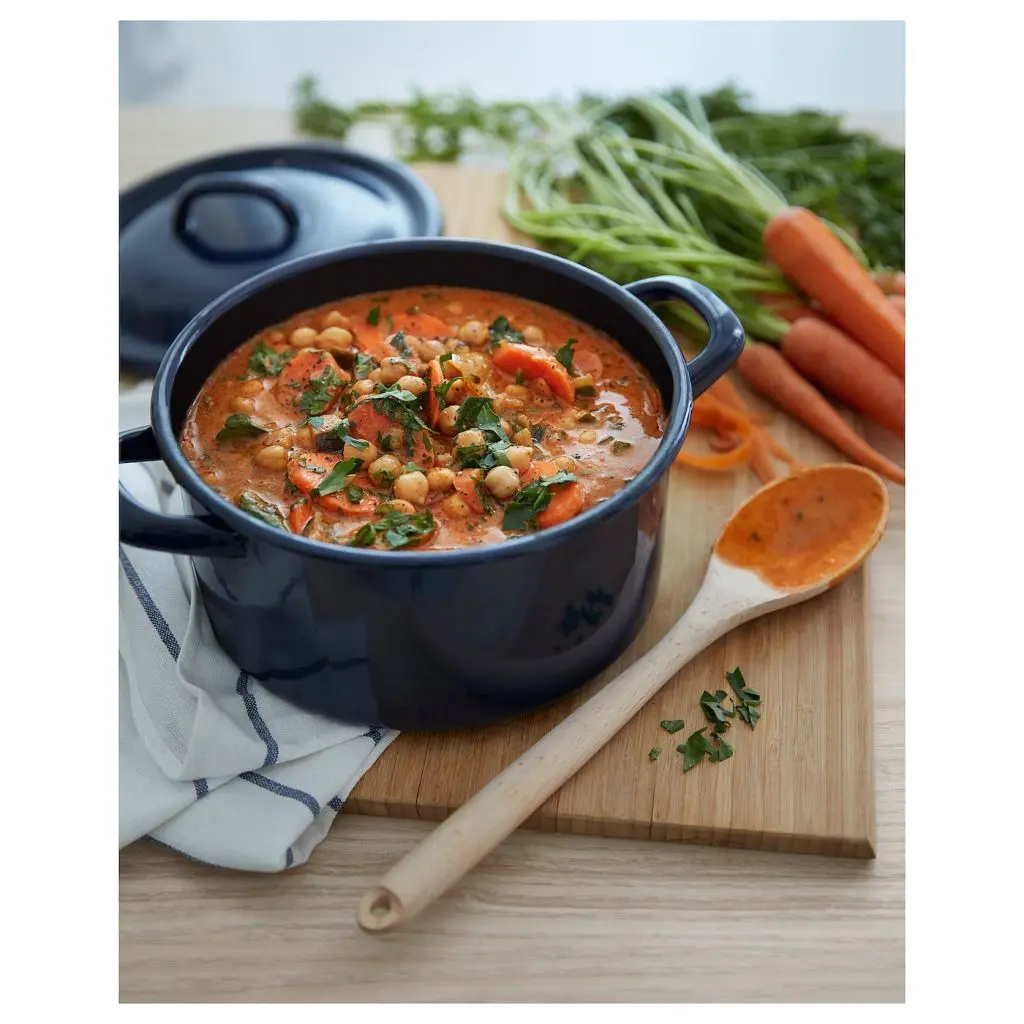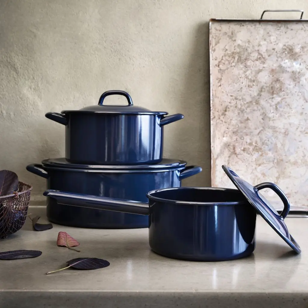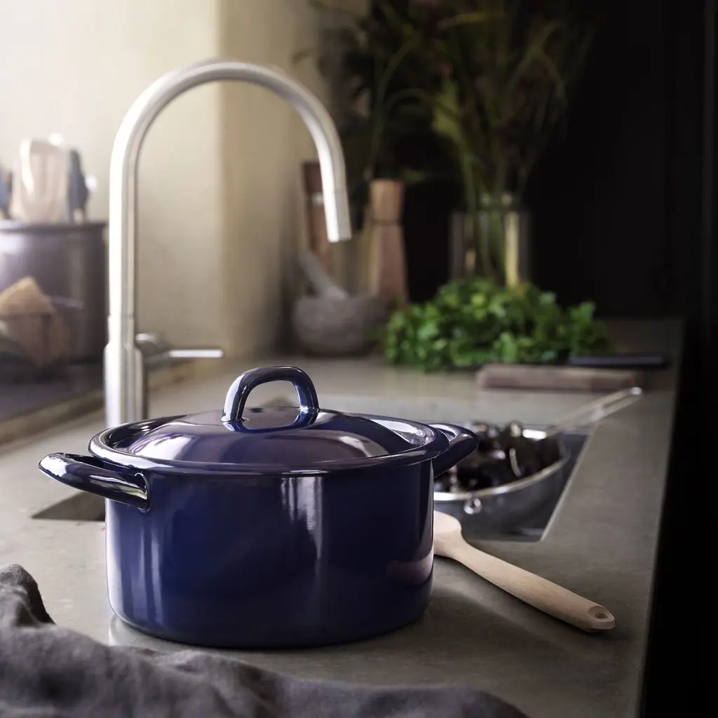В этой эмалированной кастрюле в традиционном стиле приятно готовить на плите или в духовке, подавать блюдо на стол и удобно хранить «завтрашний» обед в холодильнике.