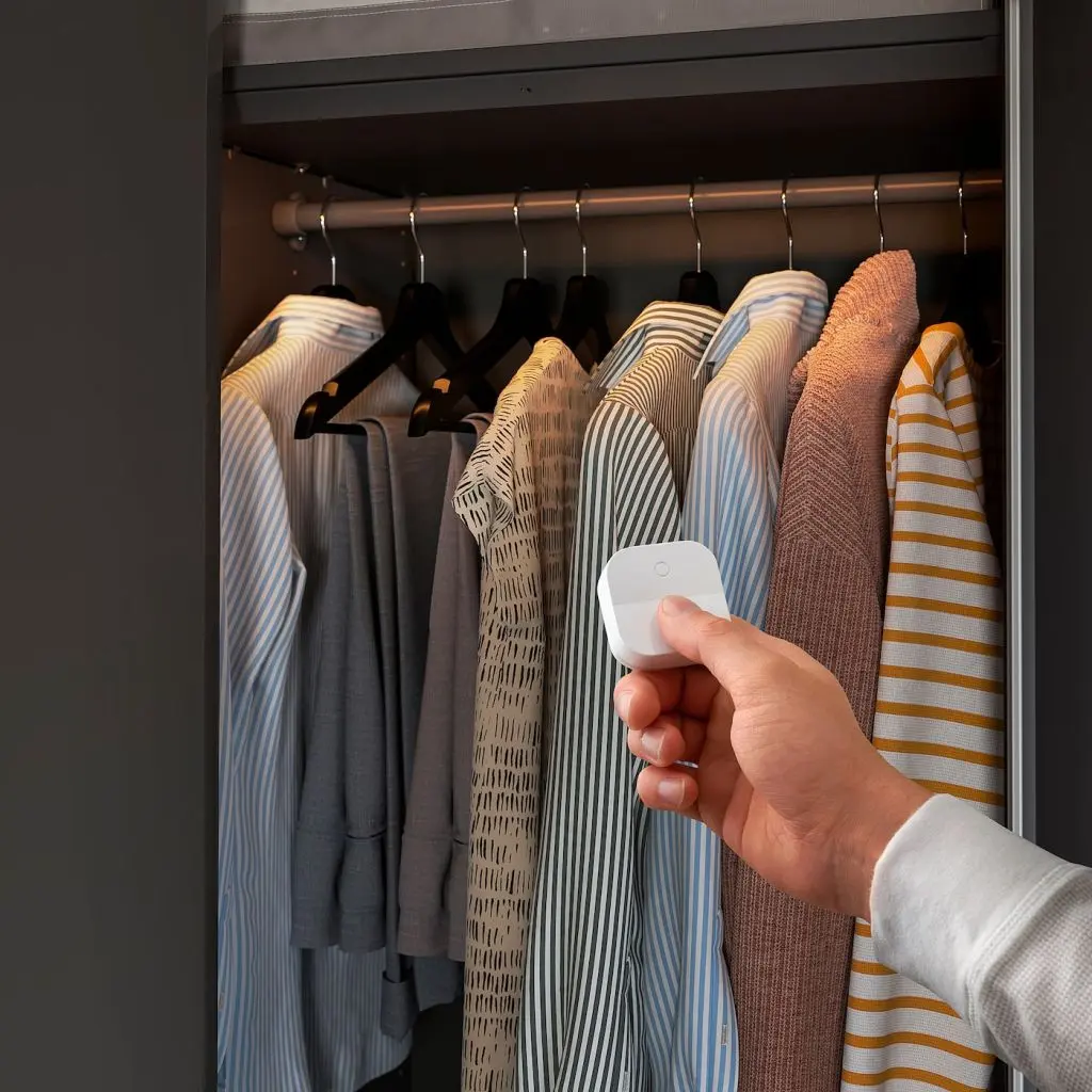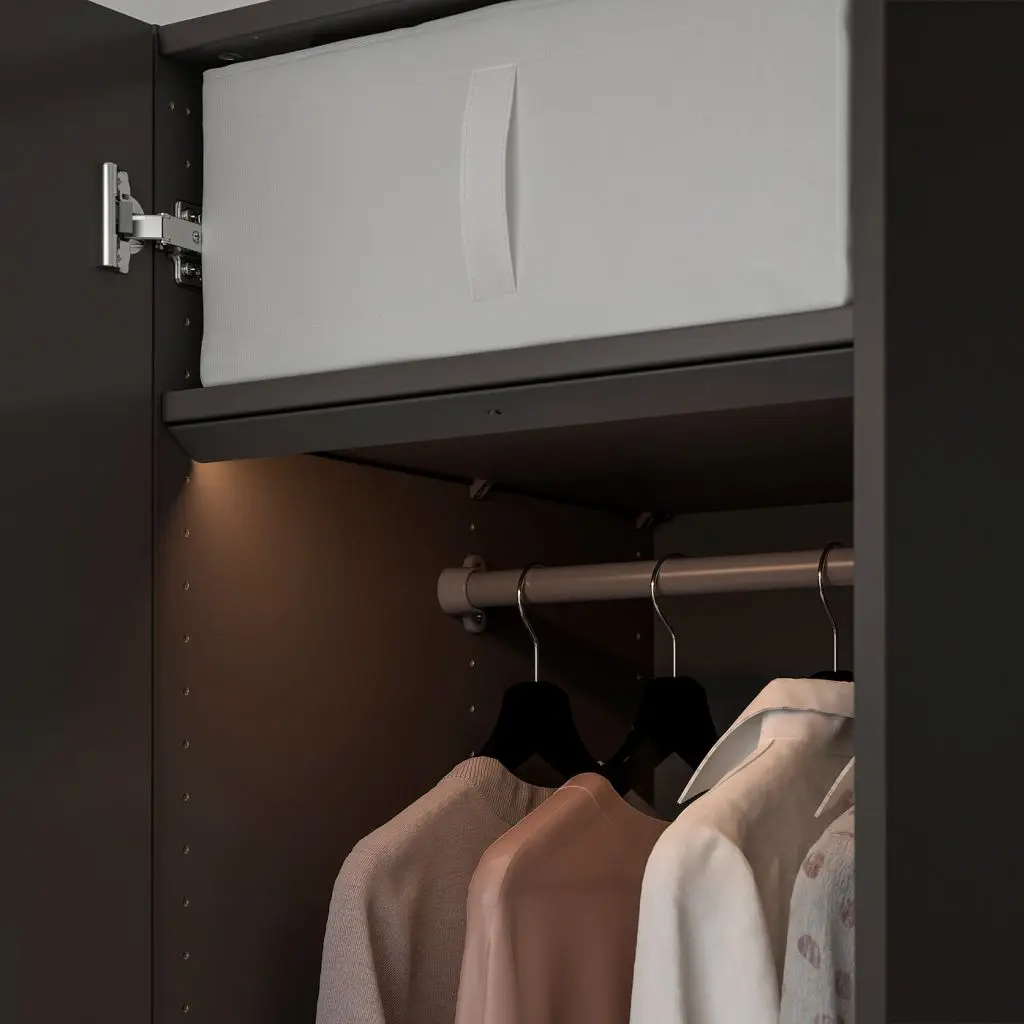 Темно в гардеробе? Эту проблему легко решить с помощью современной светодиодной подсветки со встроенным датчиком, которая была разработана специально для гардеробов ПАКС.