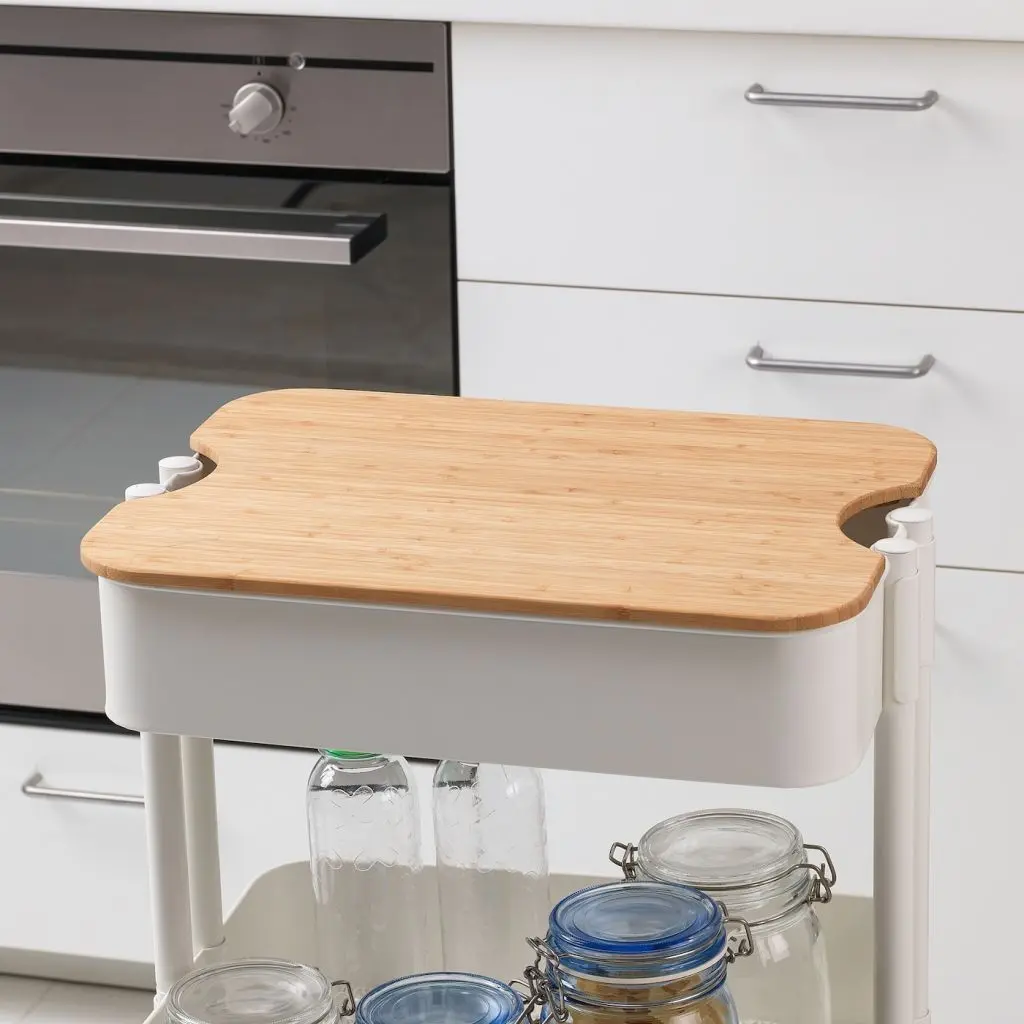 Бамбук – прочный натуральный и простой в уходе материал, который не повредит лезвия ножей.Также можно использовать как поднос или подставку под горячее.Подходитдля тележки РОСКУГ 35x45x78 см.Если вы использует разделочную доску как крышку для тележки РОСКУГ, то чтобы резать на ней, доску необходимо снять с тележки и положить на устойчивую поверхность.