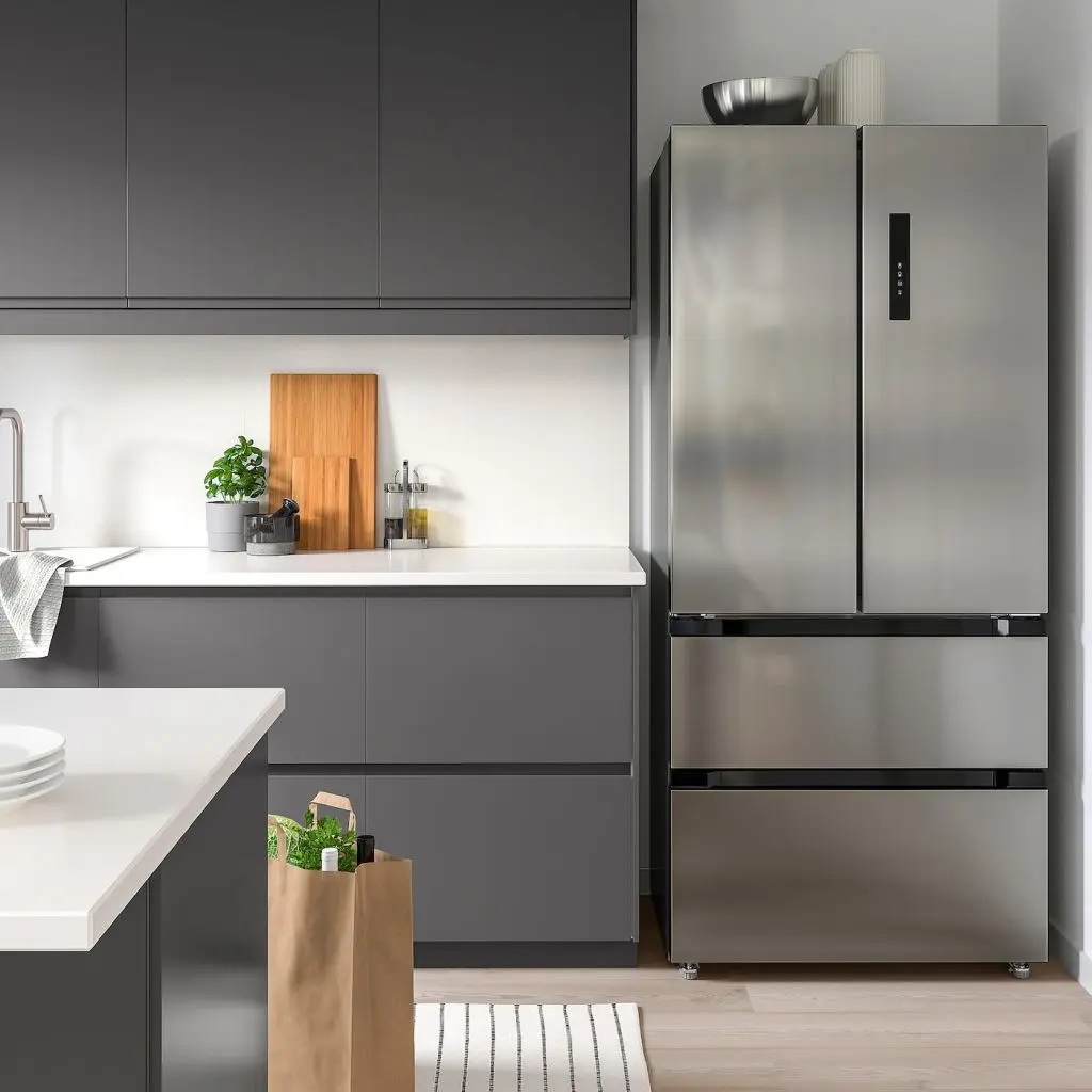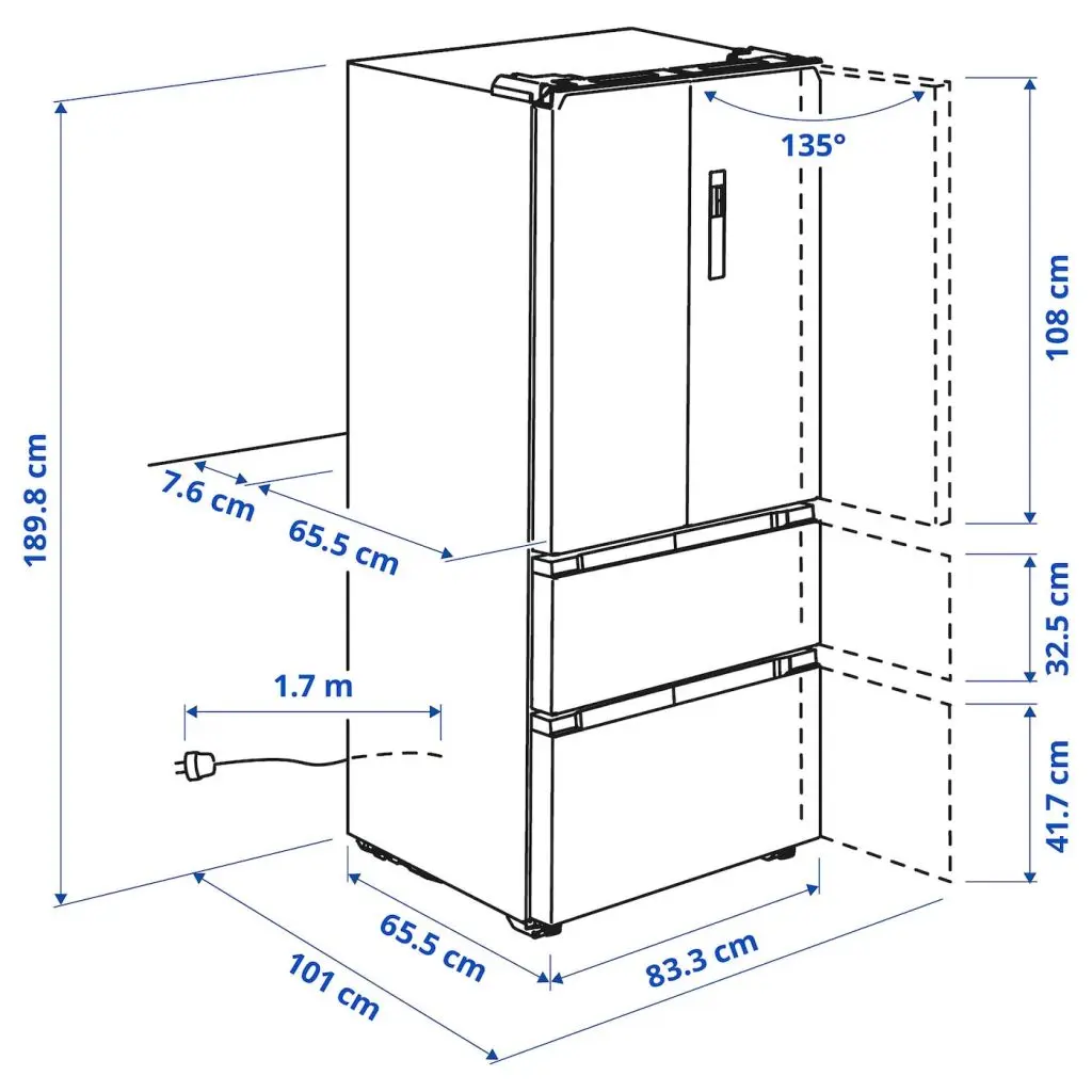 Бесплатно 5 лет гарантии. Подробнее об условиях гарантии — в гарантийной брошюре.С помощью уникальной технологии очиститель воздуха устраняет в холодильнике неприятные запахи. Воздух постоянно ионизируется, что способствует поддержанию гигиеничной среды — и при этом не надо менять фильтры.Холодильник оснащен встроенным вентилятором, который обеспечивает ровную температуру. Это позволяет использовать все внутреннее пространство и хранить самые разные продукты.Два датчика при появлении в холодильнике новых продуктов автоматически выявляют изменения температуры и регулирует ее таким образом, чтобы не допустить колебаний.Вы можете отрегулировать температуру и влажность в выдвижных ящиках холодильника, чтобы создать идеальный климат для хранения ваших продуктов.Съемные полки из закаленного стекла позволят адаптировать внутреннее пространство холодильной камеры в соответствии с вашими потребностями в хранении.Функция быстрого охлаждения большого количества свежих продуктов и напитков. Отличное решение для больших закупок.Функция быстрой заморозки для больших объемов продуктов. Обеспечивает быстрое понижение температуры, что позволяет сохранять свежесть и полезные свойства продуктов.Не требует разморозки. Функция «no frost» автоматически регулирует уровень влажности, что предотвращает образование инея.Благодаря встроенной светодиодной подсветке в холодильнике не останется ни одного темного уголка. Лампочка не требует технического обслуживания и работает в течение всего срока службы холодильника, чтобы вы всегда могли видеть, что в нем хранится.Наружный сенсорный дисплей показывает статус настроек холодника/морозильника, таких как основные функции, температура и предупреждающий сигнал.Если дверца закрыта неплотно, раздается звуковой сигнал.Этот товар имеет маркировку CE.Вы найдете полную информацию об установке и использовании этого товара в разделе «Инструкции по сборке и документы».Система разморозки: Автоматическая.3 съемные полки прилагаются.2 ящика для овощей/фруктов прилагаются.2 больших морозильных ящика с отделениями.Дизайнер