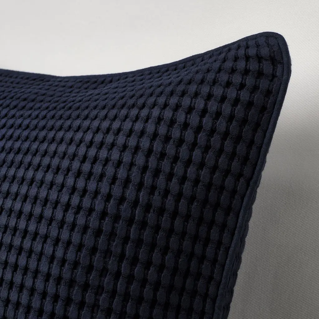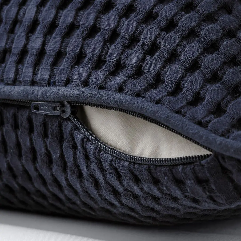 Этот невероятно мягкий и плотный чехол из вафельной ткани поднимет ваш комфорт на новый уровень. Черно-синяя рельефная поверхность приятна на ощупь. Подушка с таким чехлом поможет вам с легкостью освежить интерьер.