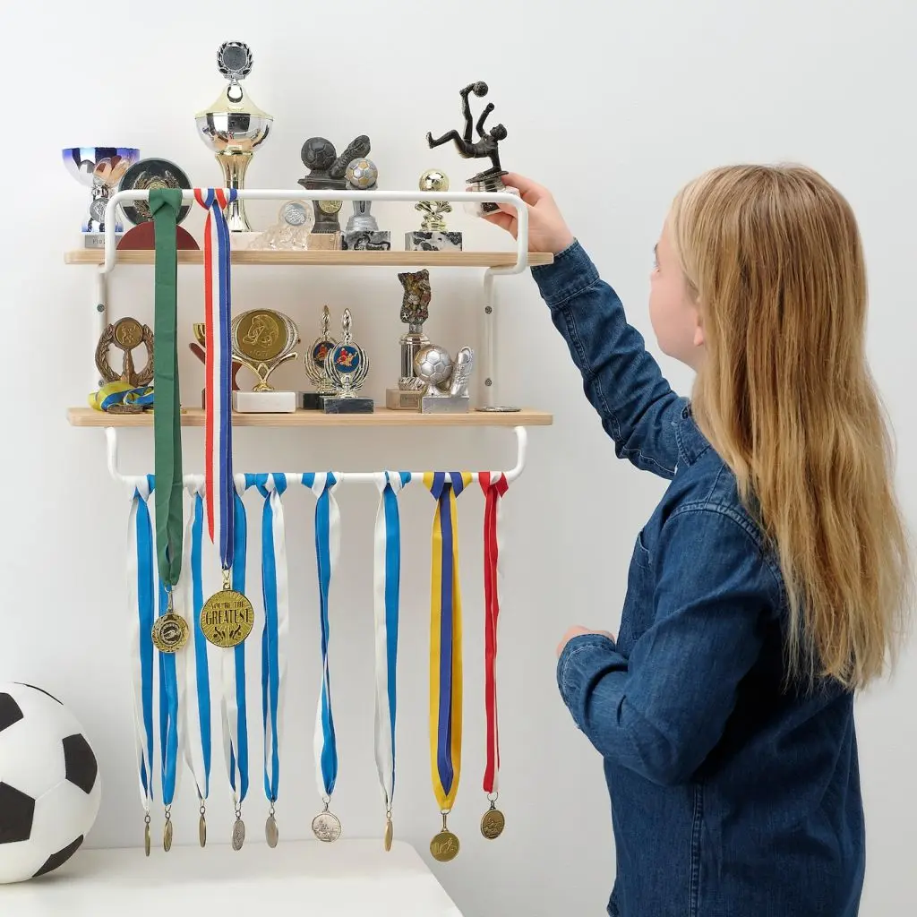 Дети всегда гордятся своими достижениями. На металлических штангах этой навесной полки можно повесить медали, а на самих деревянных полках найдется много места для кубков и грамот.