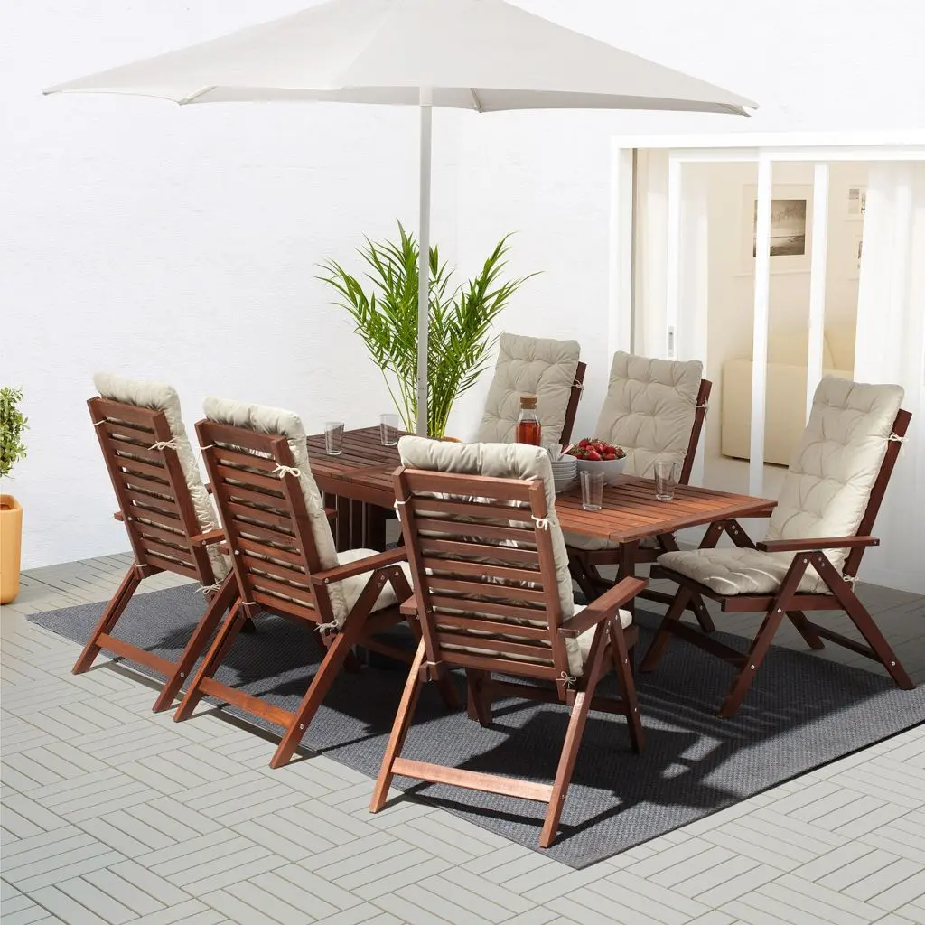 Откидные столешницы легко установить и убрать, что позволяет регулировать размер стола по необходимости.Отверстие в центре столешницы позволяет установить зонт от солнца.Спинку можно установить в одном из пяти положений.Мебель обработана полупрозрачной морилкой в несколько слоев. Это повышает ее прочность и подчеркивает выразительность натуральной фактуры дерева.Двустороннюю подушку можно переворачивать, это продлевает срок службы подушки.Стол (мин. длина 140 см, ср. длина 200 см, макс. длина 260 см, ширина 78 см, высота 72 см); стул (ширина 63 см, глубина 80 см, высота 101 см; ширина сиденья 44 см, глубина сиденья 48 см, высота сиденья 41 см).6 подушек прилагаются.Можно убирать на хранение в мешок или сундук серии ТОСТЕРО.Можно дополнить чехлом ТОСТЕРО для комплекта мебели 215×135 см.Рекомендовано для использования на улице.Дизайнер