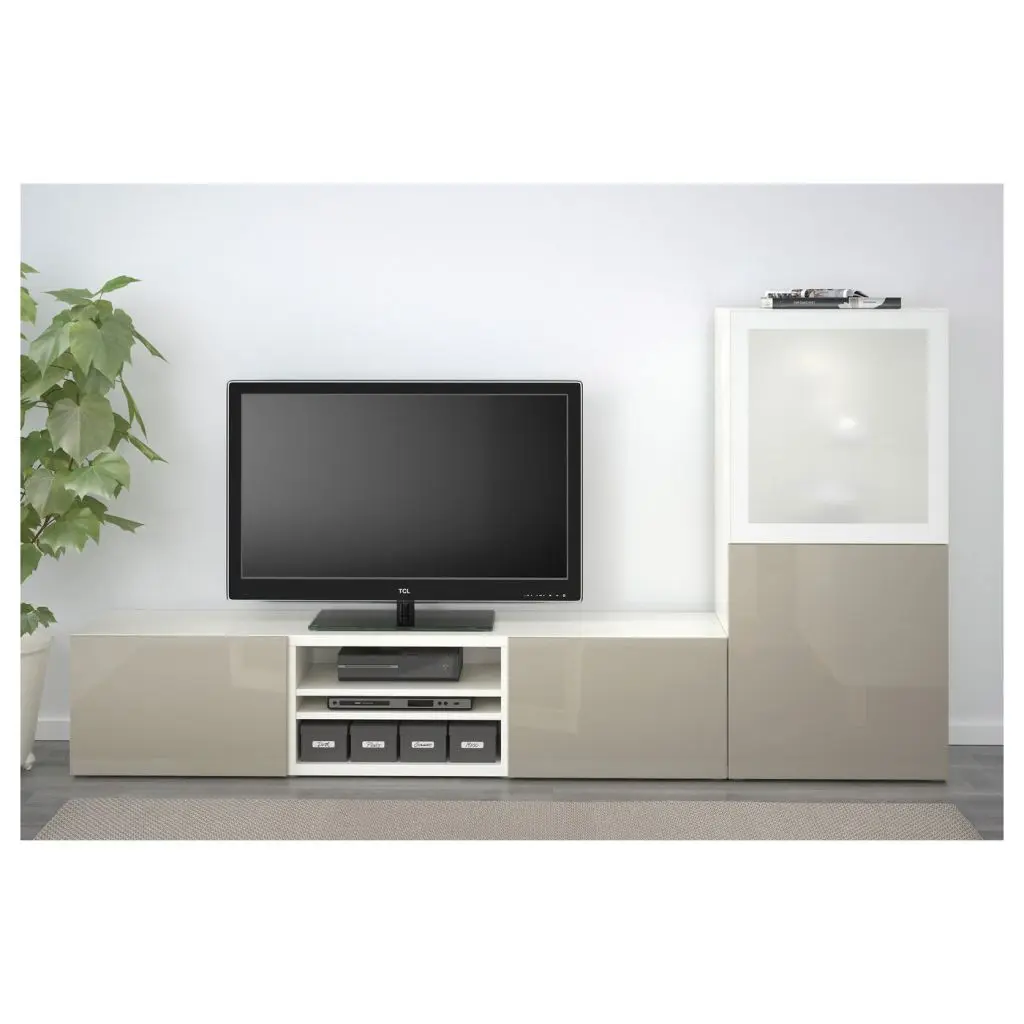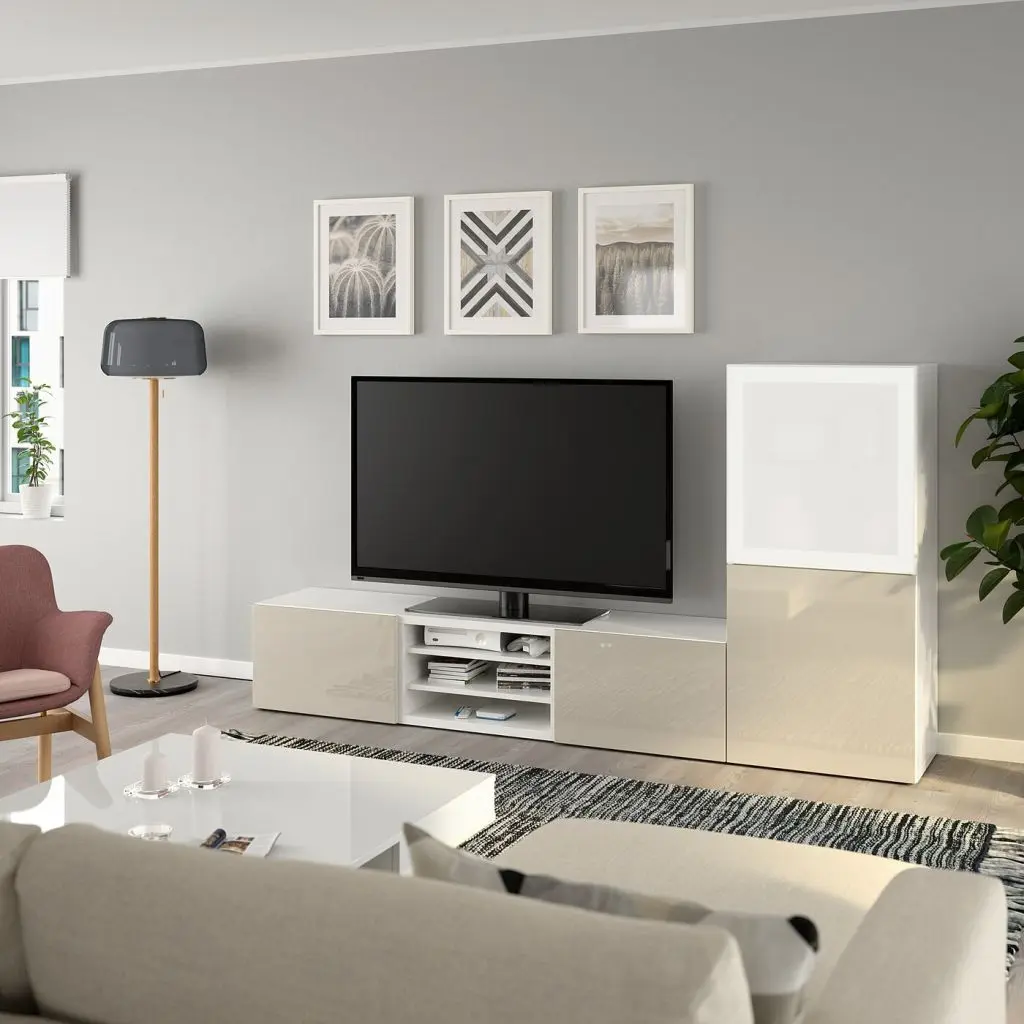 Благодаря доводчикам ящики закрываются плавно и бесшумно.Благодаря нескольким отверстиям на задней панели тумбы под ТВ провода от телевизора и других устройств всегда будут под рукой, но не на виду.Два ящика и полки за дверцами обеспечат достаточно места для хранения.Съемные полки позволяют регулировать пространство.Специальное отверстие в верхней панели обеспечит удобное и компактное размещение проводов.Эту мебель необходимо крепить к стене с помощью прилагаемого стенного крепежа.Будьте осторожны при обращении с закаленным стеклом! Из-за поврежденных краев и царапин на поверхности стекло может внезапно разбиться.Макс. нагрузка на верхнюю панель этой тумбы под ТВ: 50 кг.Для разных стен требуются различные крепежные приспособления. Подберите подходящие для ваших стен шурупы, дюбели, саморезы и т. п. (не прилагаются).Максимальная нагрузка на закрепленный на стене модуль зависит от материала стены.Внутренние элементы для организации хранения в модулях БЕСТО продаются отдельно.Если вы выберете функцию плавного закрывания, рекомендуем дополнить фасады ручками, чтобы открывать ящики/шкафы было удобнее.Дизайнер