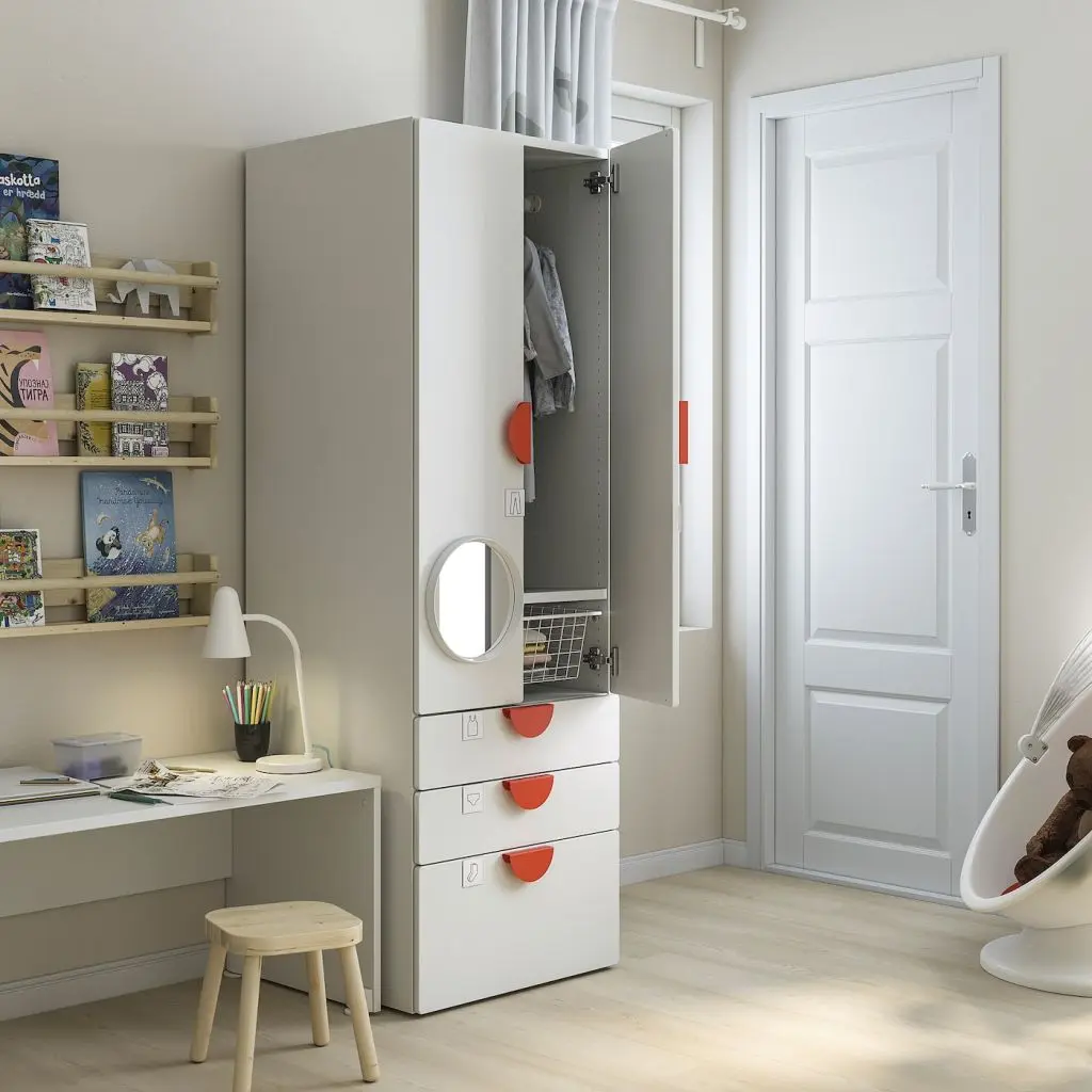 Ребенок может пользоваться этим гардеробом много лет, т. к. глубина шкафа позволяет развешивать в нем одежду на плечиках стандартного размера, а высоту его внутренних элементов можно менять по мере роста ребенка.Двери с петлями для плавного закрывания всегда закрываются бесшумно — даже в разгар жаркого спора.ВНИМАНИЕ! ОПАСНОСТЬ ОПРОКИДЫВАНИЯ! Незакрепленная мебель может опрокинуться. Эту мебель необходимо крепить к стене с помощью прилагаемого крепежа для предотвращения опрокидывания.1 платяная штанга, 2 полки, 1 проволочная корзина, 2 крючка для платяной штанги ХЭЛПА и 2 крючка/зажима ЛЭТТХЕТ прилагаются.Для разных стен требуются различные крепежные приспособления. Подберите подходящие для ваших стен шурупы, дюбели, саморезы и т. п. (не прилагаются).Чтобы вещи было легче находить, можно дополнить окошками для этикетки ХЭНГИГ (продаются отдельно)Ручки продаются отдельно.