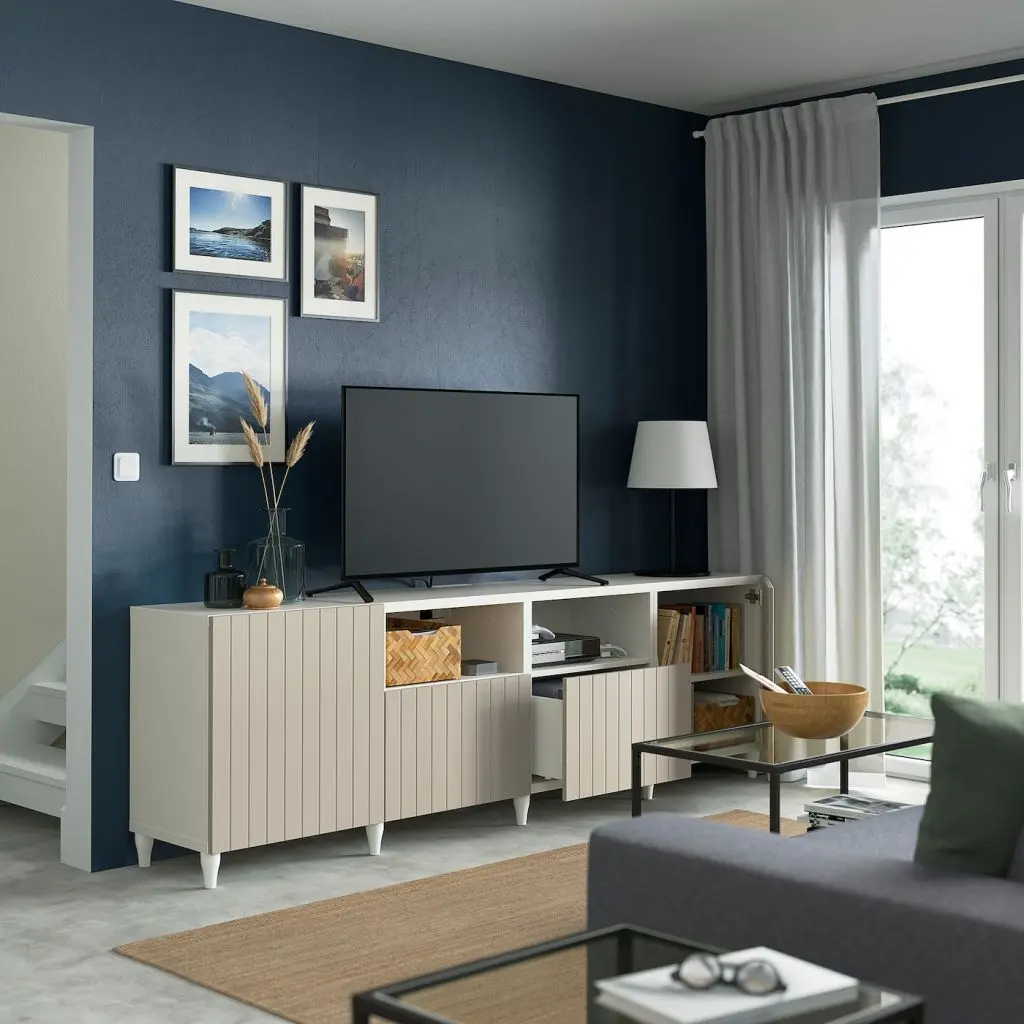 Специальное отверстие в верхней панели обеспечит удобное и компактное размещение проводов.Благодаря нескольким отверстиям на задней панели тумбы под ТВ провода от телевизора и других устройств всегда будут под рукой, но не на виду.Благодаря интегрированному нажимному механизму ящики открываются легким нажатием.Два ящика обеспечат порядок в хранении пультов, игровых приставок и других аксессуаров для ТВ.Съемные полки позволяют регулировать пространство.Организуйте и оптимизируйте систему для хранения БЕСТО, используя подходящие коробки и вставки.Мы рекомендуем, чтобы тумба была немного шире, чем установленный на ней телевизор. Эта тумба подходит для телевизора до 99 дюймов. Вы можете выбрать телевизор большего размера, если он не тяжелее указанной максимальной нагрузки на верхнюю панель тумбы.Верхняя панель этой тумбы предназначена для телевизора весом макс. 50 кг.Для функционирования нажимного механизма необходимо пространство между каркасом и фронтальной панелью ящика, чтобы ящик открывался нажатием. Небольшой зазор необходим для обеспечения этой функции и не является недостатком товара.Тумбу под ТВ необходимо крепить к стене с помощью прилагающегося стенного крепежа.