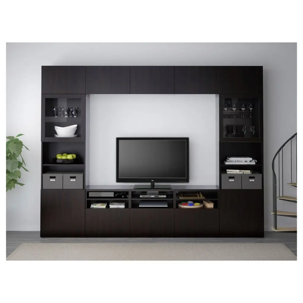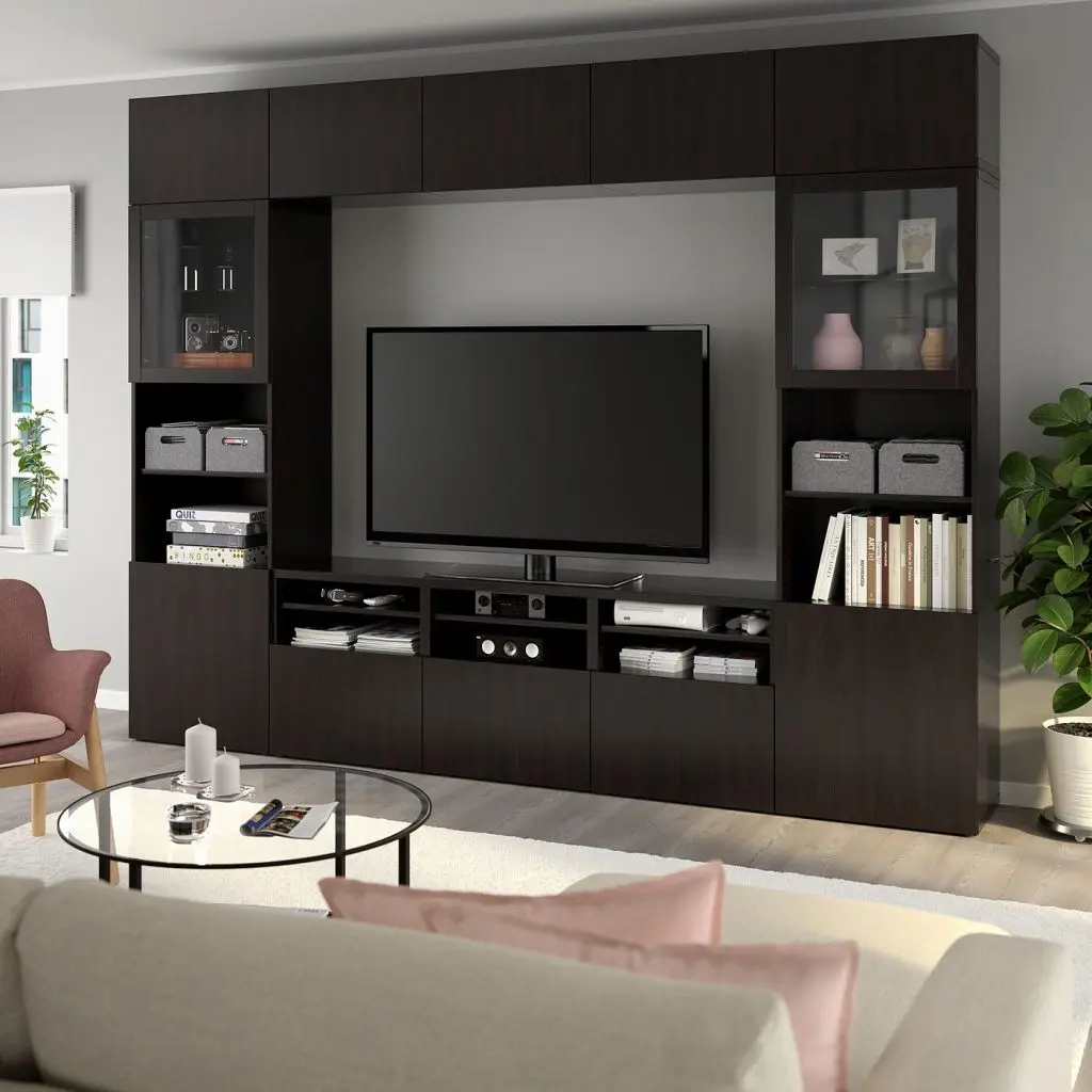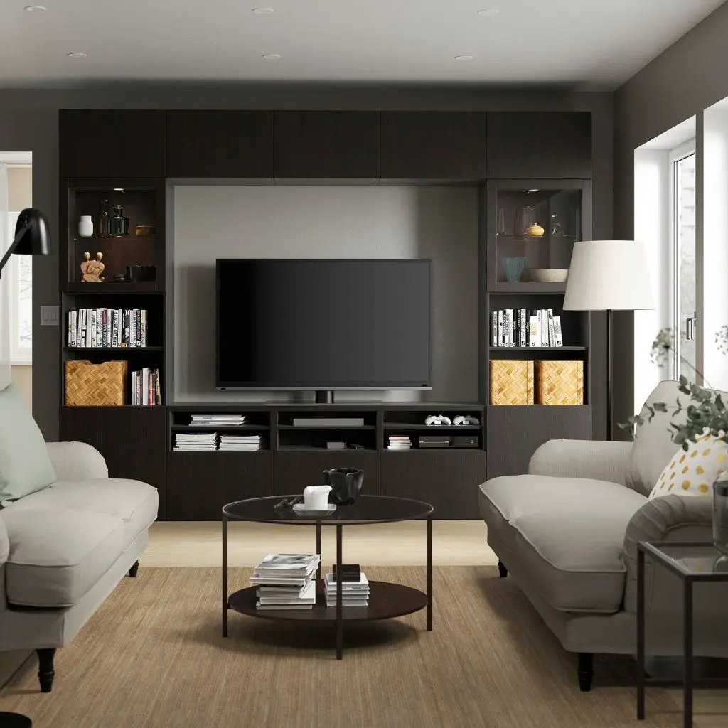 Благодаря нескольким отверстиям на задней панели тумбы под ТВ провода от телевизора и других устройств всегда будут под рукой, но не на виду.Специальное отверстие в верхней панели обеспечит удобное и компактное размещение проводов.Ящики со встроенным нажимным механизмом открываются легким нажатием.Ящики обеспечат более упорядоченное хранение ваших вещей. А полки за дверцами предоставят еще больше места.Организуйте и оптимизируйте систему для хранения БЕСТО, используя подходящие коробки и вставки.Съемные полки позволяют регулировать пространство.Настенные шкафчики позволяют эффективно использовать пространство над телевизором.Эту мебель необходимо крепить к стене с помощью прилагаемого стенного крепежа.Будьте осторожны при обращении с закаленным стеклом! Из-за поврежденных краев и царапин на поверхности стекло может внезапно разбиться.Для функционирования нажимного механизма необходимо пространство между каркасом и фронтальной панелью ящика, чтобы ящик открывался нажатием. Небольшой зазор необходим для обеспечения этой функции и не является недостатком товара.