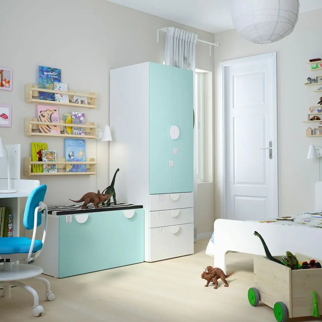 Ребенок может пользоваться этим гардеробом много лет, т. к. глубина шкафа позволяет развешивать в нем одежду на плечиках стандартного размера, а высоту его внутренних элементов можно менять по мере роста ребенка.В гардеробе на платяной штанге есть место для хранения вещей на плечиках, в проволочной корзине и на нескольких полках — для одежды в сложенном виде, а в ящиках — для носков и белья.В большом ящике найдется много места для громоздких предметов, например больших мягких игрушек или мячей, поэтому ребенок сможет быстро наводить порядок в своей комнате.Двери с петлями для плавного закрывания всегда закрываются бесшумно — даже в разгар жаркого спора.