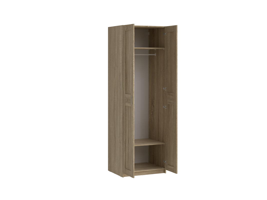 Шкаф МАКС для одежды двухдверный, 750х610х2330, цвет Дуб Сонома. Укомлектован двумя полками и штангой для вешалок. Изготовлен из кашированного ДСП толщиной 18 мм. Крепится к стене. Гарантийный срок для жилых помещений 24 месяца, для общественных помещений — 18 месяцев.