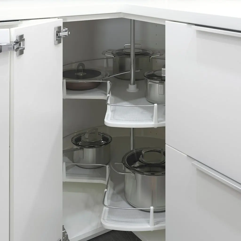 2 вращающиеся полки максимально эффективно используют пространство углового шкафа, обеспечивая удобный обзор и доступ к содержимому.Съемные полки позволяют регулировать внутреннее пространство.Полка с меламиновым покрытием устойчива к появлению царапин и проста в уходе.Идеально подходит для хранения кастрюль, противней, сухих продуктов и т.п.Бесплатно 25 лет гарантии. Подробнее об условиях гарантии – в гарантийной брошюре.Подходит для углового напольного шкафа с левосторонней или правосторонней.Дизайнер