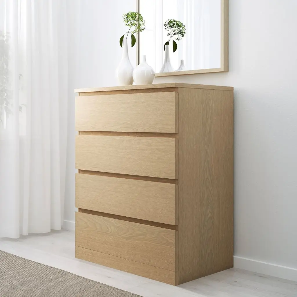 Ваш дом должен быть абсолютно безопасен для всей семьи. Именно поэтому крепеж безопасности для фиксации комода к стене прилагается.Благодаря отделке из шпона дерева этот комод с годами будет выглядеть только лучше.Чтобы ящики не выпадали при открывании, они оснащены специальным стопором.ВНИМАНИЕ! ОПАСНОСТЬ ОПРОКИДЫВАНИЯ! Незакрепленная мебель может опрокинуться. Эту мебель необходимо крепить к стене с помощью прилагаемого крепежа для предотвращения опрокидывания.Для различных материалов стен требуются различные крепежные средства. Используйте крепежные средства, подходящие для материала стен в вашем доме.В ящик можно положить примерно 15 пар брюк или 30 футболок.Дизайнер