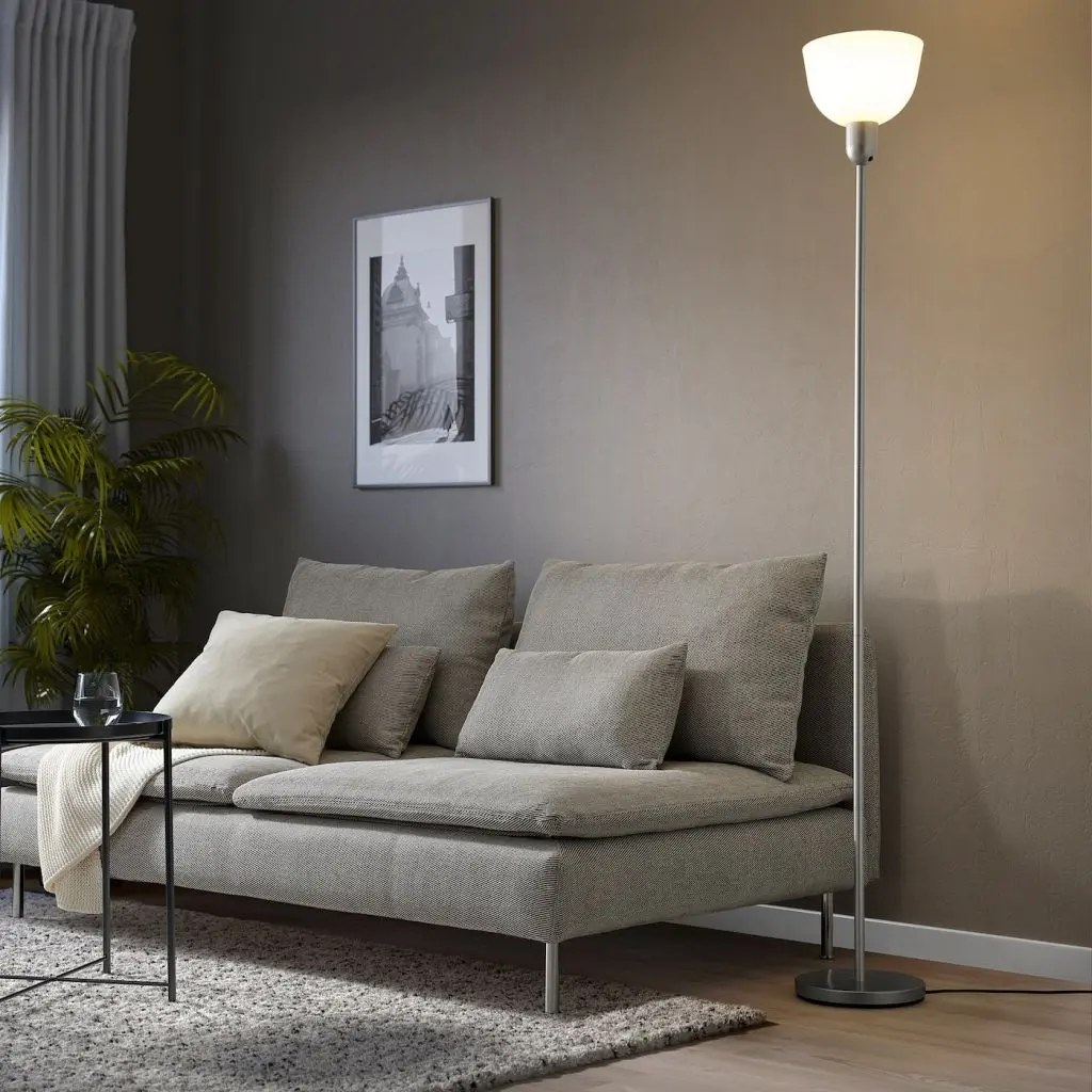 Глянцевый белый абажур направляет свет вверх, создавая мягкое рассеянное освещение и располагающую атмосферу в комнате.