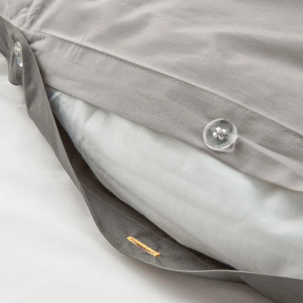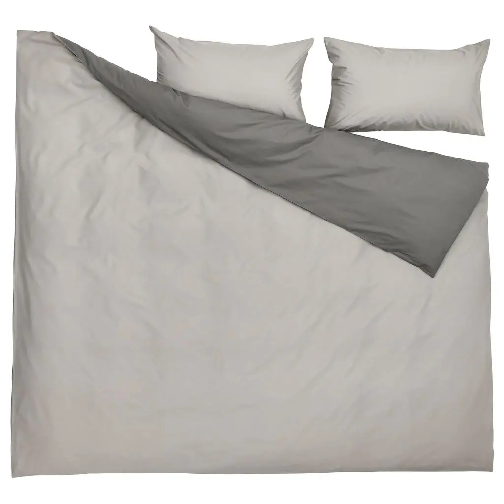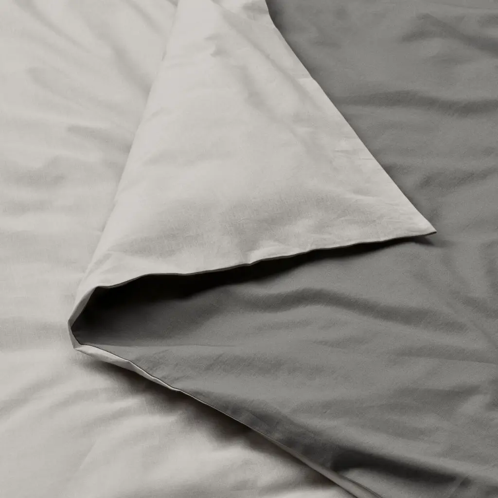 Пододеяльник серый с одной стороны и темно-серый — с другой. Плотная перкаль с приятным легким блеском из смеси хлопка и вискозы превосходно пропускает воздух и впитывает влагу, обеспечивая комфортный сон.