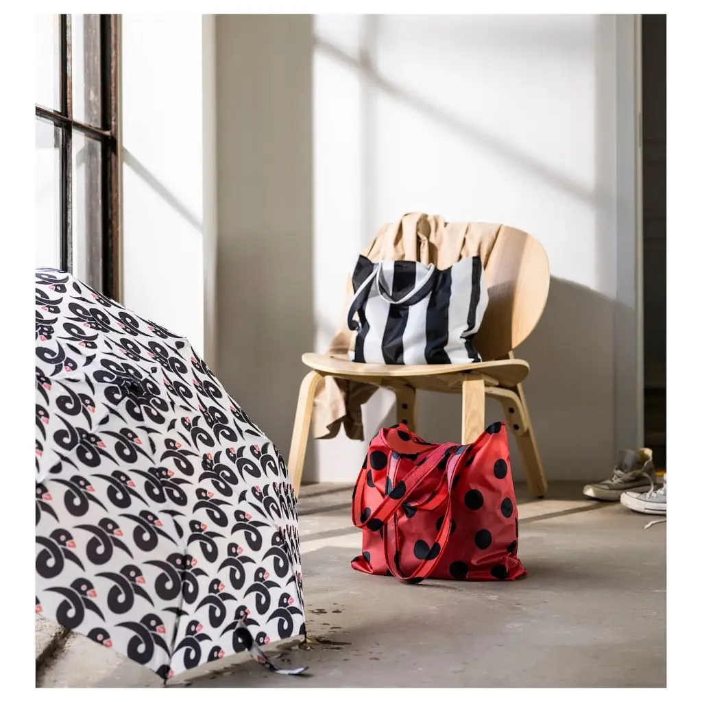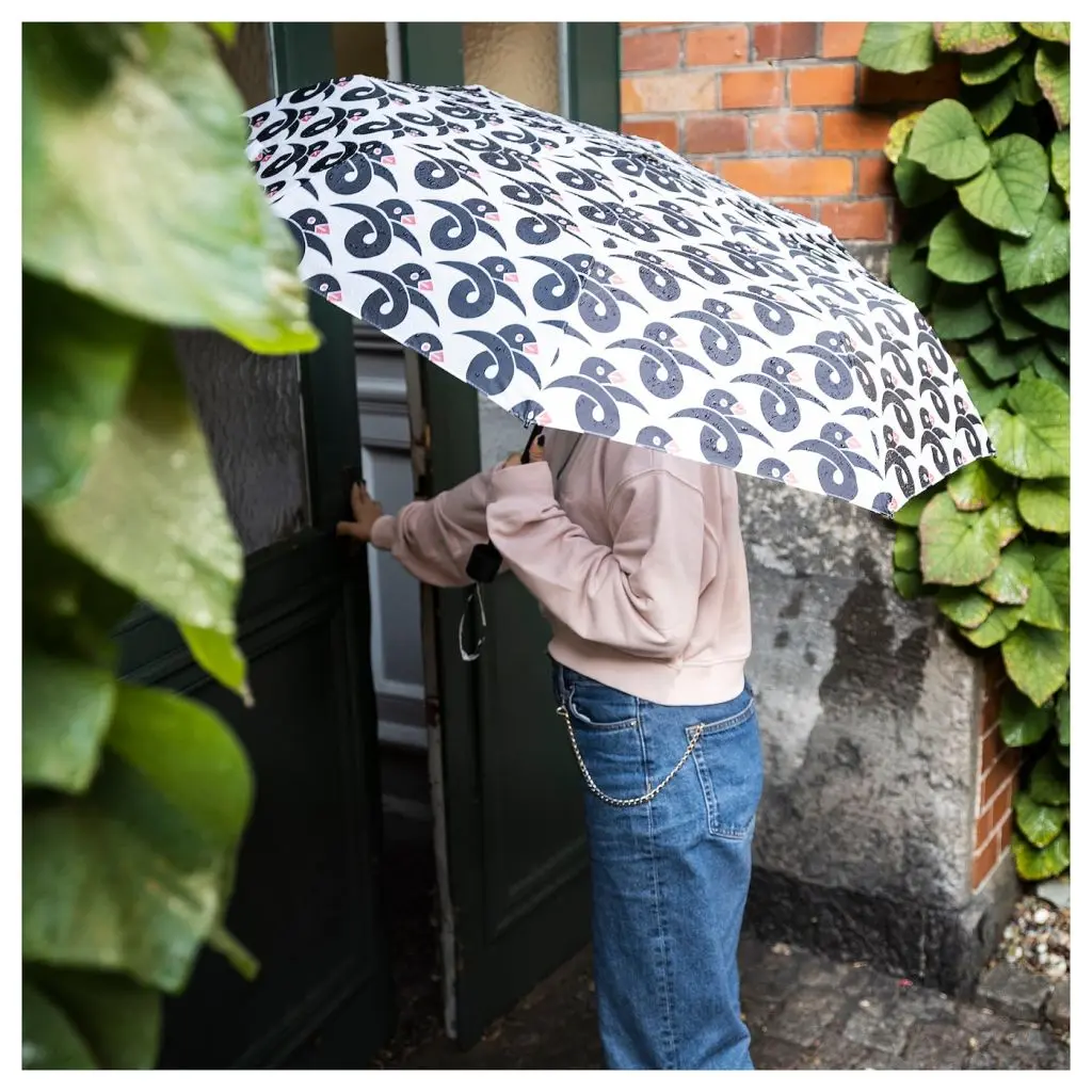 Этот складной зонтик поместится в сумку, а в разложенном виде обеспечит надежную защиту даже от сильного дождя. Графичный орнамент с изображением птичек создал для него дизайнер Том Хедквист, который работал в составе группы «10 шведских дизайнеров».