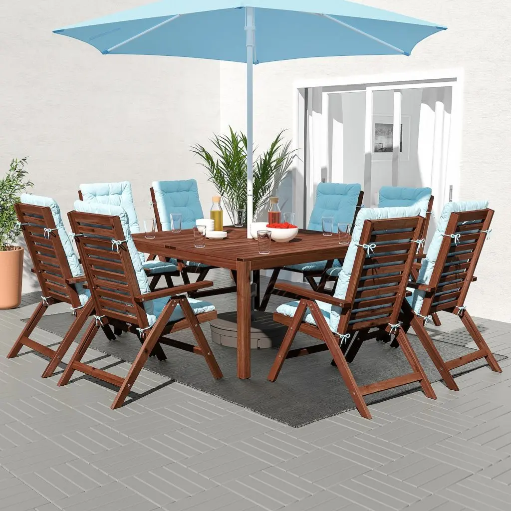 Отверстие в центре столешницы позволяет установить зонт от солнца.Мебель обработана полупрозрачной морилкой в несколько слоев. Это повышает ее прочность и подчеркивает выразительность натуральной фактуры дерева.Спинку можно установить в одном из пяти положений.Двустороннюю подушку можно переворачивать, это продлевает срок службы подушки.Завязки удерживают подушку для спинки/сиденья на месте.В комплект входит: стол (длина 140 см, ширина 140 см, высота 72 см), стул (ширина 63 см, глубина 80 см, ширина сиденья 44 см, глубина сиденья 48 см, высота сиденья 41 см, высота 101 см).8 подушек прилагаются.Рекомендовано для использования на улице.Можно убирать на хранение в мешок или сундук серии ТОСТЕРО.Для повторной обработки используйте морилку, продается отдельно.Дизайнер