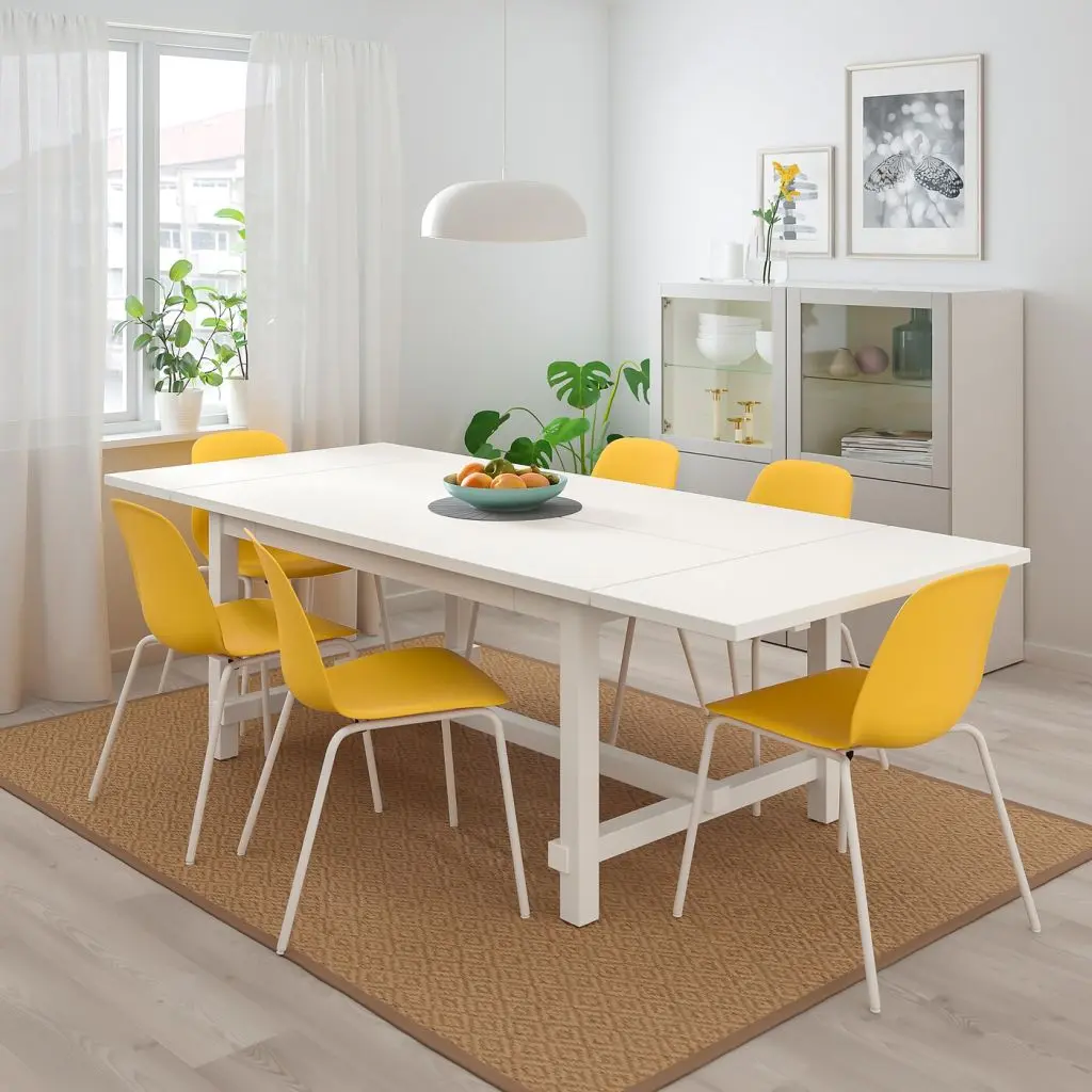 За этим столом комфортно разместятся 6 человек.Обработка белой морилкой подчеркивает красоту и выразительность фактуры натурального дерева.Традиционный дизайн этого прочного деревянного стола прекрасно впишется в интерьер любого стиля — от современного до кантри.Специальный фиксатор предотвращает падение вкладных досок, когда вы достаете их из-под столешницы.Вкладные доски хранятся под столешницей за откидными планками по длинным сторонам стола.1 человек может легко и быстро разложить стол перед приходом гостей.Подстолье из массива дерева обеспечивает устойчивость конструкции.На центральную перекладину подстолья можно поставить ноги, чтобы наслаждаться чашечкой чая с максимальным комфортом.Эргономичная форма спинки и сиденья обеспечивает оптимальный комфорт.Стулья можно штабелировать, что позволяет экономить место при хранении.Данный стул протестирован и одобрен для бытового использования и соответствует требованиям к безопасности, долговечности и устойчивости, установленным стандартами EN 12520 и EN 1022.Рекомендуется использовать только в помещении.На 4-6 человек.Для обеспечения устойчивости через две недели после сборки еще раз затяните шурупы. В дальнейшем подтягивайте шурупы при необходимости.Дизайнер