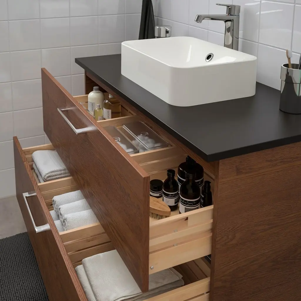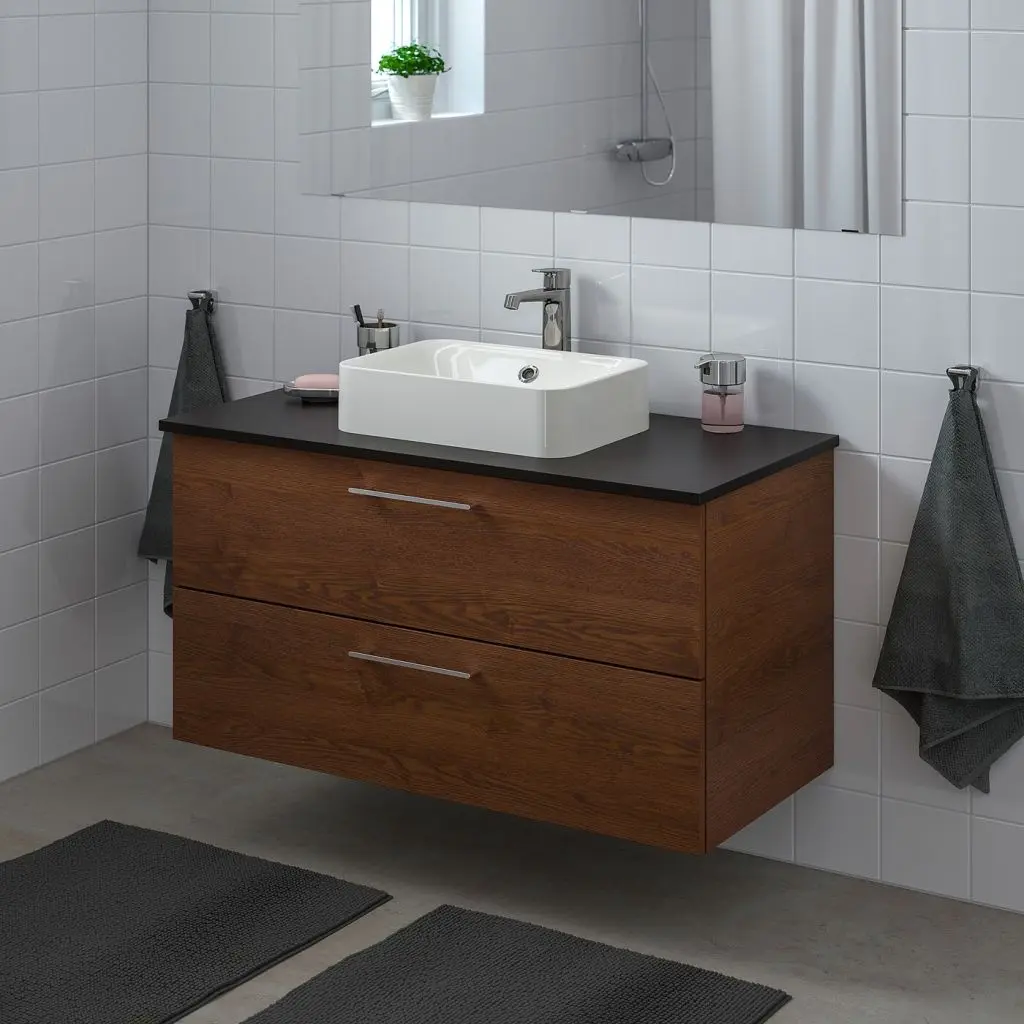 Бесплатно 10 лет гарантии. Подробнее об условиях гарантии – в гарантийной брошюре.Ламинированные столешницы отличает высокая прочность, простота в уходе и долговечность.Раковину можно установить справа, слева или посередине.Ящик с плавным ходом и стопором.Размер отделений можно регулировать, передвигая разделитель.Ящики выдвигаются полностью, обеспечивая удобный обзор и доступ к содержимому.Ящики изготовлены из массива дерева, дно изготовлено из устойчивого к повреждениям меламина.Конструкция сифона позволяет разместить полноразмерный ящик.Накладная раковина придает ванной законченный индивидуальный облик.Ножки ГОДМОРГОН продаются отдельно.Обратите, пожалуйста, внимание, что для установки раковины в столешницу вам потребуются силиконовый уплотнитель и лобзик (продаются отдельно).Ручки прилагаются.Выпуск и сифон прилагаются.Смеситель прилагается.Раковина устойчива к воздействию большинства химикатов, за исключением сильных кислот и сильных щелочей.Эту мебель необходимо крепить к стене с помощью прилагаемого стенного крепежа.Если вы сомневаетесь в прочности стен в ванной, мы рекомендуем использовать ножки.Используйте прилагающийся шаблон для установки раковины на столешницу.Мойку в столешницу следует устанавливать через 2 часа после нанесения силиконового уплотнителя на столешницу, чтобы он успел затвердеть.Для сборки этой мебели требуются два человека.Убедитесь, что материалы, из которых сделаны стены ванной комнаты, выдержат вес мебели. Если у вас возникли сомнения по поводу установки, обратитесь к специалисту. Для разных стен требуются различные шурупы, дюбели, саморезы и т. п. (не прилагаются).Дизайнер