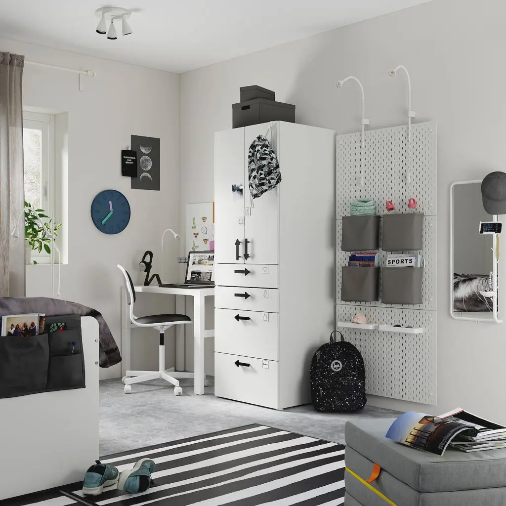 Ребенок может пользоваться этим гардеробом много лет, т. к. глубина шкафа позволяет развешивать в нем одежду на плечиках стандартного размера, а высоту его внутренних элементов можно менять по мере роста ребенка.Двери с петлями для плавного закрывания всегда закрываются бесшумно — даже в разгар жаркого спора.Регулируемые ножки прилагаются, обеспечивают устойчивость даже на неровном полу.ВНИМАНИЕ! ОПАСНОСТЬ ОПРОКИДЫВАНИЯ! Незакрепленная мебель может опрокинуться. Эту мебель необходимо крепить к стене с помощью прилагаемого крепежа для предотвращения опрокидывания.1 платяная штанга, 1 полка и 2 крючка/зажима ЛЭТТХЕТ прилагаются.Для разных стен требуются различные крепежные приспособления. Подберите подходящие для ваших стен шурупы, дюбели, саморезы и т. п. (не прилагаются).Чтобы вещи было легче находить, можно дополнить окошками для этикетки ХЭНГИГ (продаются отдельно)Ручки продаются отдельно.