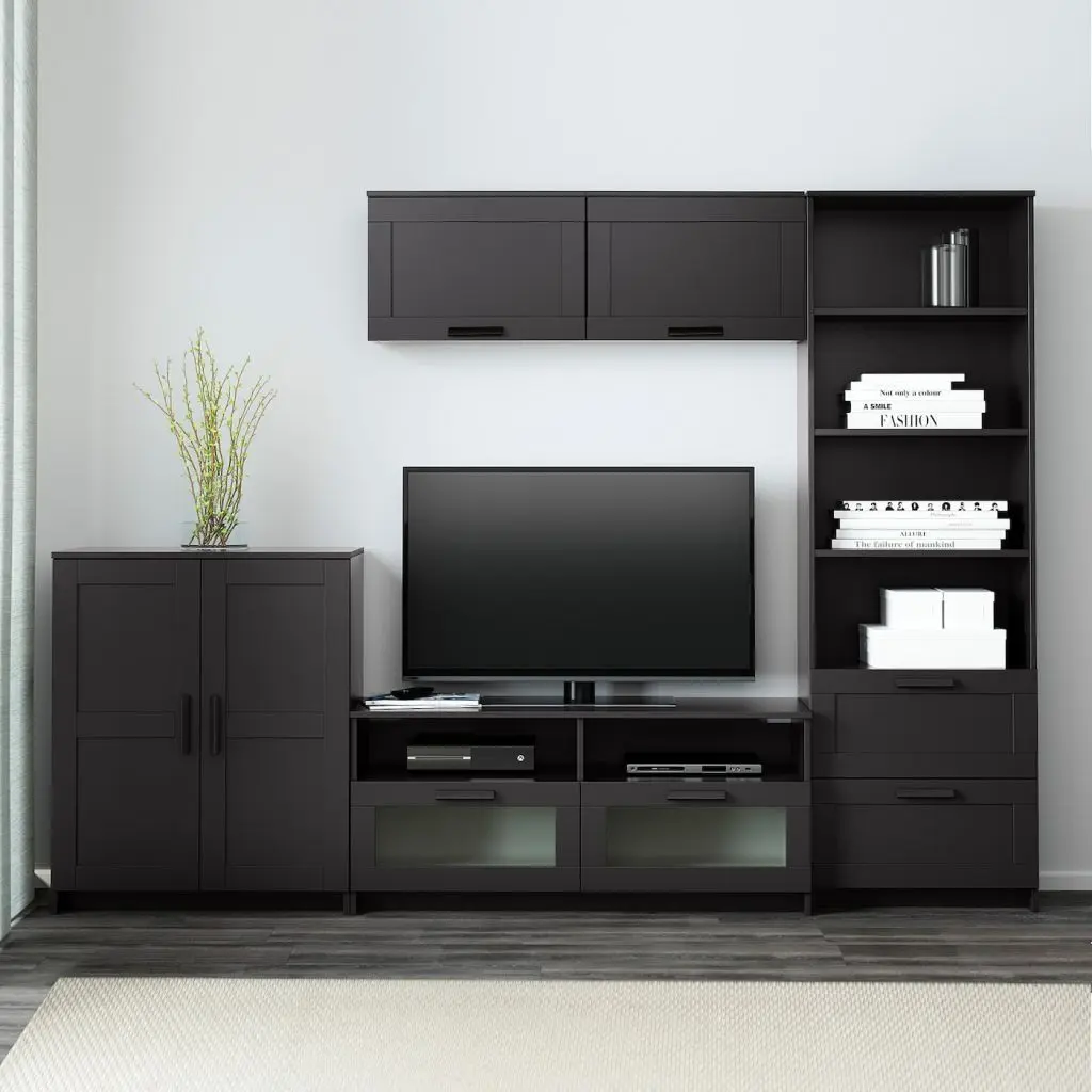 Эта комбинация для ТВ предоставит достаточно места для хранения, чтоб в вашей гостиной царил идеальный порядок.Глухие дверцы защитят содержимое от пыли.Отверстия для проводов на задней панели. Провода не на виду, но всегда под рукой.Ящики с плавным ходом и стопором.Эту мебель необходимо крепить к стене с помощью прилагаемого стенного крепежа.Для разных стен требуются различные крепежные приспособления. Подберите подходящие для ваших стен шурупы, дюбели, саморезы и т. п. (не прилагаются).Комбинируется с другой мебелью серии БРИМНЭС.Дизайнер