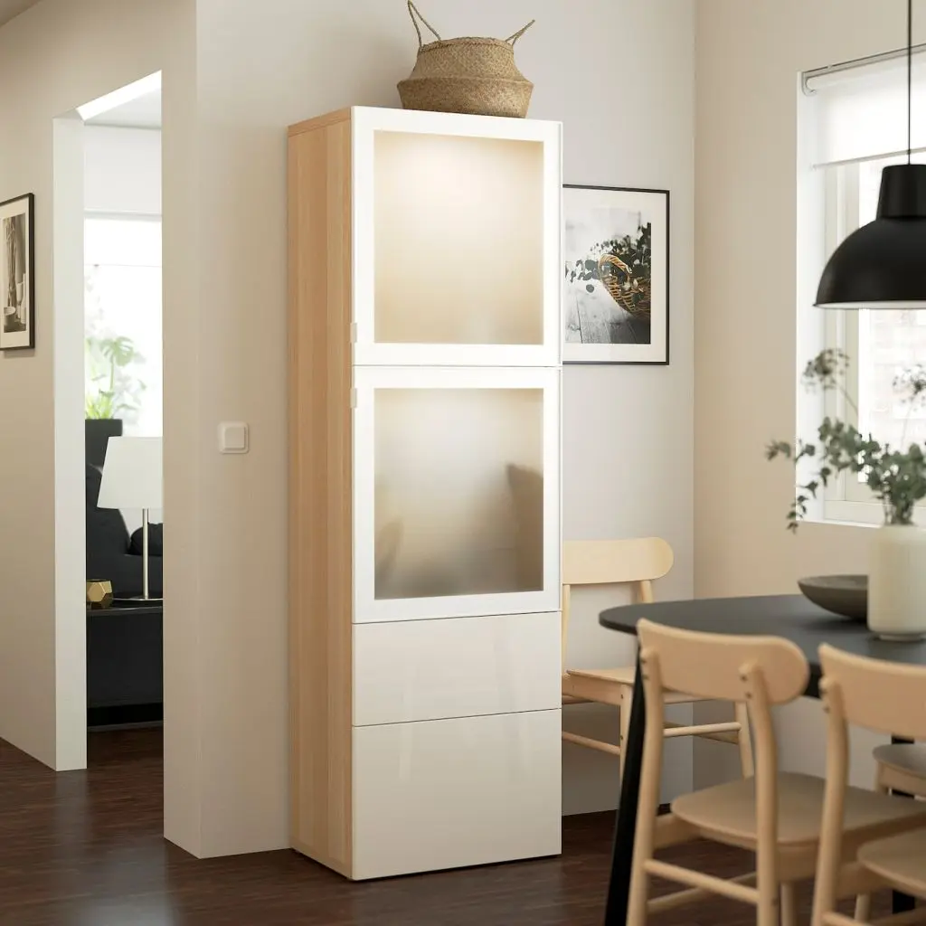 Ненужные вещи, которые часто валяются в беспорядке, можно спрятать, а любимые предметы выставить на всеобщее обозрение за стеклянными дверцами. Практичное решение для хранения и демонстрации любимых вещей с уникальным характером.