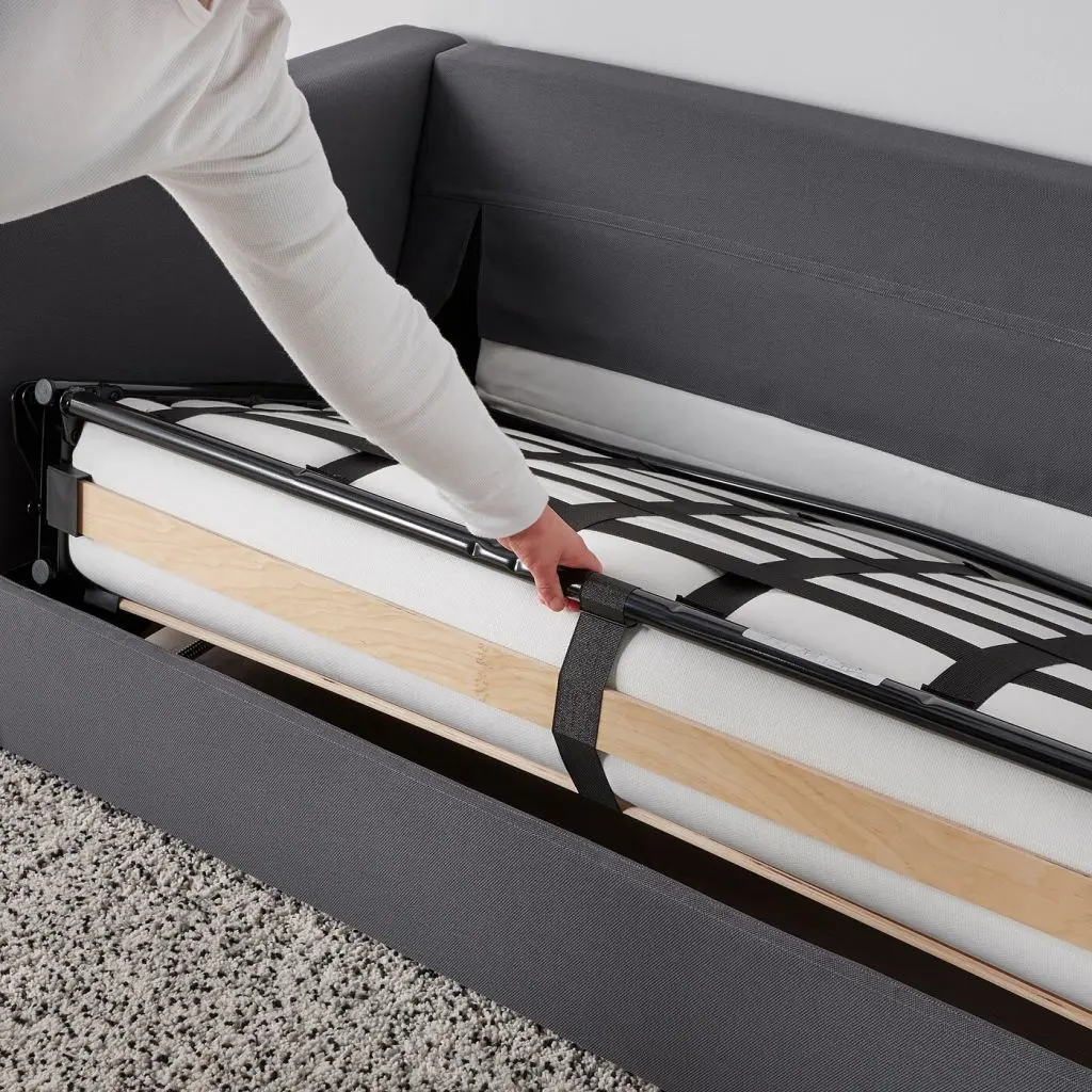 Секции ВИМЛЕ можно по-разному комбинировать, чтобы создать диван, максимально соответствующий вашим потребностям и возможностям помещения. В этой комбинации есть диван-кровать с комфортным высоким матрасом.