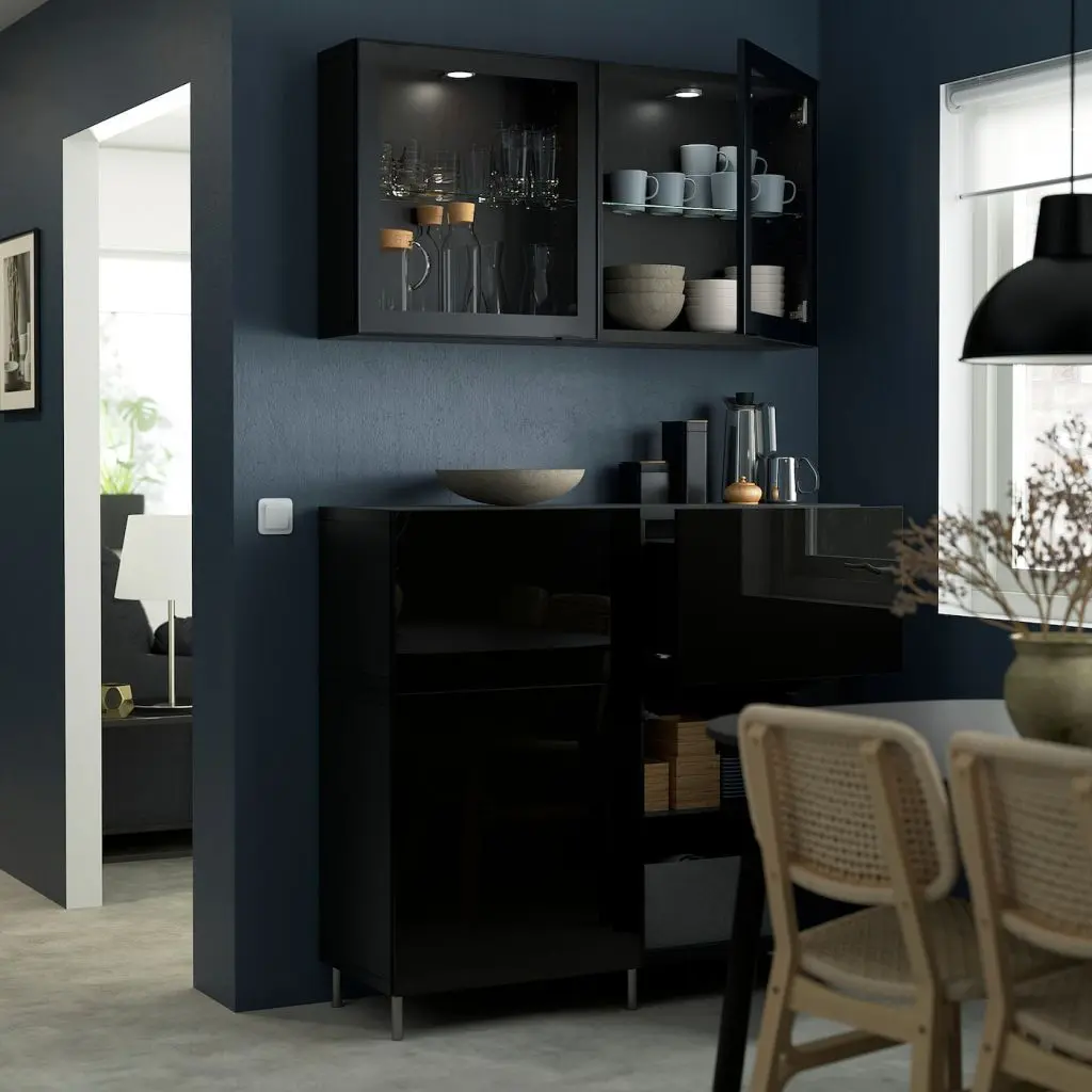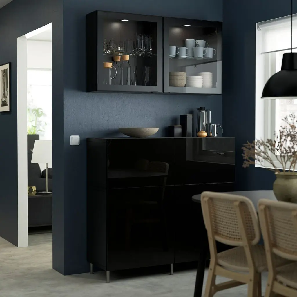 Стеклянные дверцы позволяют продемонстрировать содержимое шкафа, защищая его от пыли.Ящики со встроенным нажимным механизмом открываются легким нажатием.Конструкция петель позволяет отрегулировать и выровнять дверцу по вертикали и по горизонтали. Съемные полки позволяют регулировать пространство.Компактные навесные шкафы позволяют эффективно задействовать стену под хранение вещей.Два ящика и полки за дверцами обеспечат достаточно места для хранения.Организуйте и оптимизируйте систему для хранения БЕСТО, используя подходящие коробки и вставки.Эту мебель необходимо крепить к стене с помощью прилагаемого стенного крепежа.Будьте осторожны при обращении с закаленным стеклом! Из-за поврежденных краев и царапин на поверхности стекло может внезапно разбиться.Для разных стен требуются различные крепежные приспособления. Подберите подходящие для ваших стен шурупы, дюбели, саморезы и т. п. (не прилагаются).Для функционирования нажимного механизма необходимо пространство между каркасом и фронтальной панелью ящика, чтобы ящик открывался нажатием. Небольшой зазор необходим для обеспечения этой функции и не является недостатком товара.