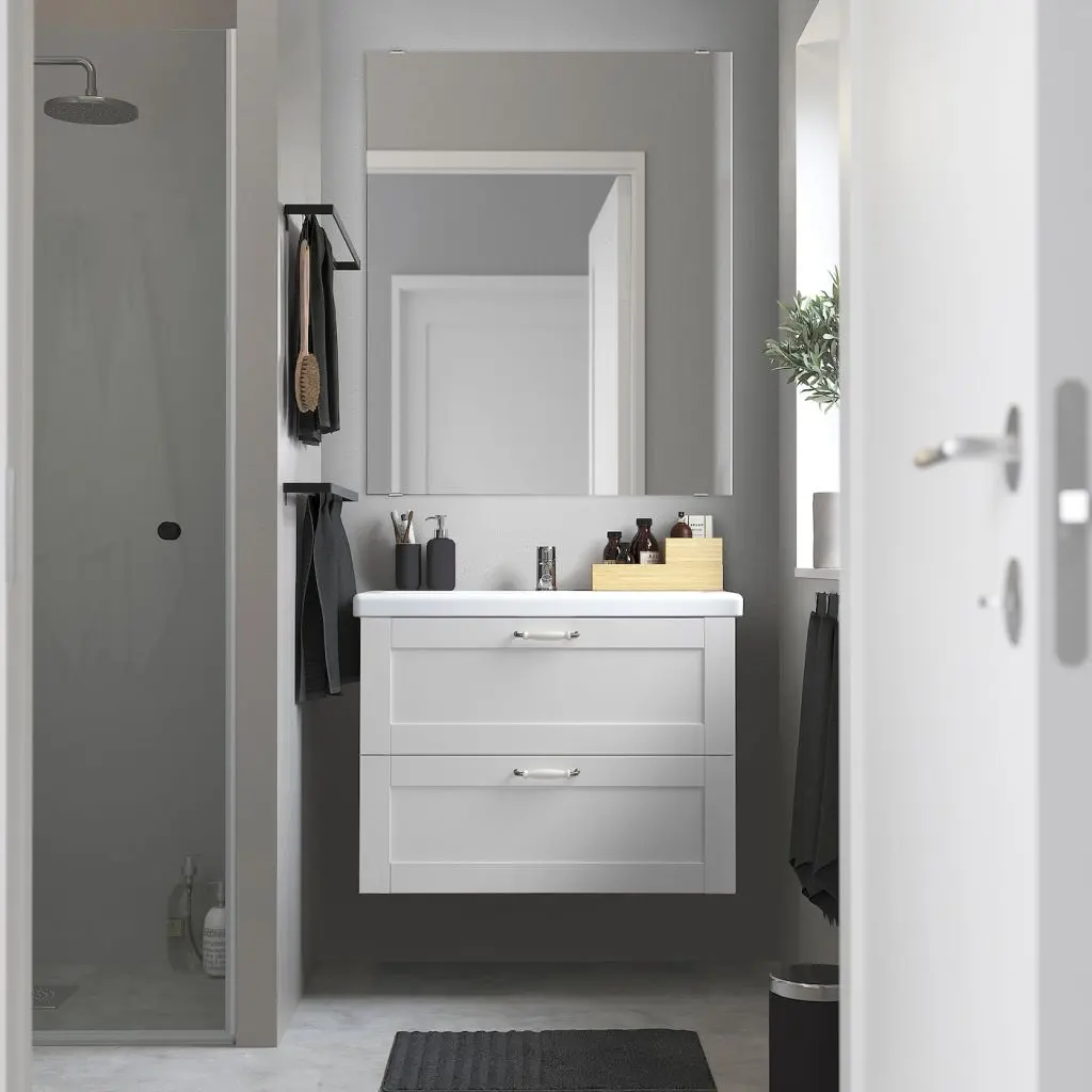 Этот напольный шкаф шириной 80 см обеспечит вашим вещам место, которого они заслуживают.Вещи, которые используются часто — ватные диски, щетки и средства гигиены, удобно хранить в верхнем ящике, а для полотенец используйте нижний ящик.Плоские зеркала делают ванную комнату более просторной. Специальная пленка защитит стекло от повреждений и сделает зеркало более безопасным.Интегрированный в смеситель аэратор поддерживает оптимальный напор, при этом используется меньше воды и энергии.Раковина устойчива к воздействию большинства химикатов, за исключением сильных кислот и щелочей.При возникновении вопросов по установке обратитесь к специалисту. Установку необходимо осуществлять в соответствии с местными строительными и сантехническими нормативами.