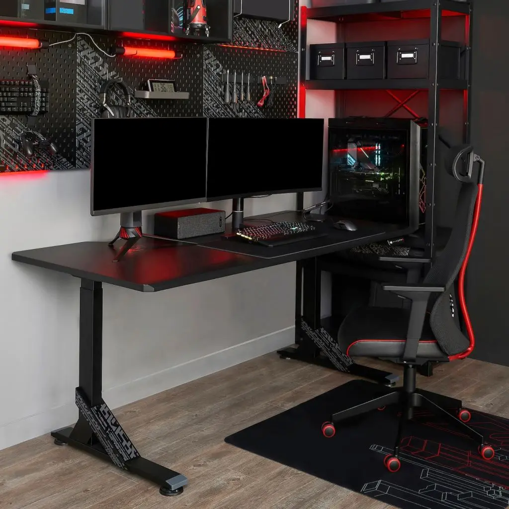 Как вы привыкли играть — сидя или стоя? Этот стол можно установить на одном из 4 уровней и легко менять высоту одним нажатием кнопки.С помощью электропривода высоту подстолья можно регулировать в диапазоне от 72 до 120 см, чтобы при желании чередовать работу сидя и стоя.Эту столешницу можно расположить по-разному. Если установить ее вырезом вперед, игрок сможет сидеть с максимальным комфортом, удобно расположив руки. А если развернуть столешницу другой стороной, вырез обеспечит место для организации проводов.Износостойкая матовая поверхность столешницы комфортна для глаз, так как не бликует под воздействием освещения.Даже играть важно с комфортом, особенно если игра затянулась. Глубокая столешница позволяет установить мониторы на удобном для глаз расстоянии.Подголовник можно поворачивать и регулировать по высоте, чтобы обеспечить хорошую опору для шеи на время игры или в перерывах.Подлокотники двигаются синхронно с вами, и их можно регулировать по высоте, чтобы максимально снизить нагрузку с рук и плеч.Сетчатый материал спинки пропускает воздух, что особенно важно, когда страсти накаляются.Колесики оснащены тормозом безопасности, реагирующим на изменение давления: они разблокируются только под воздействием веса сидящего человека.Сиденье и спинка синхронно качаются, повторяя ваши движения, чтобы вам было удобно независимо от положения тела.Прочную обивку под кожу легко чистить: достаточно протирать.Функция регулировки и фиксации наклона обеспечивает устойчивость и максимальный комфорт.