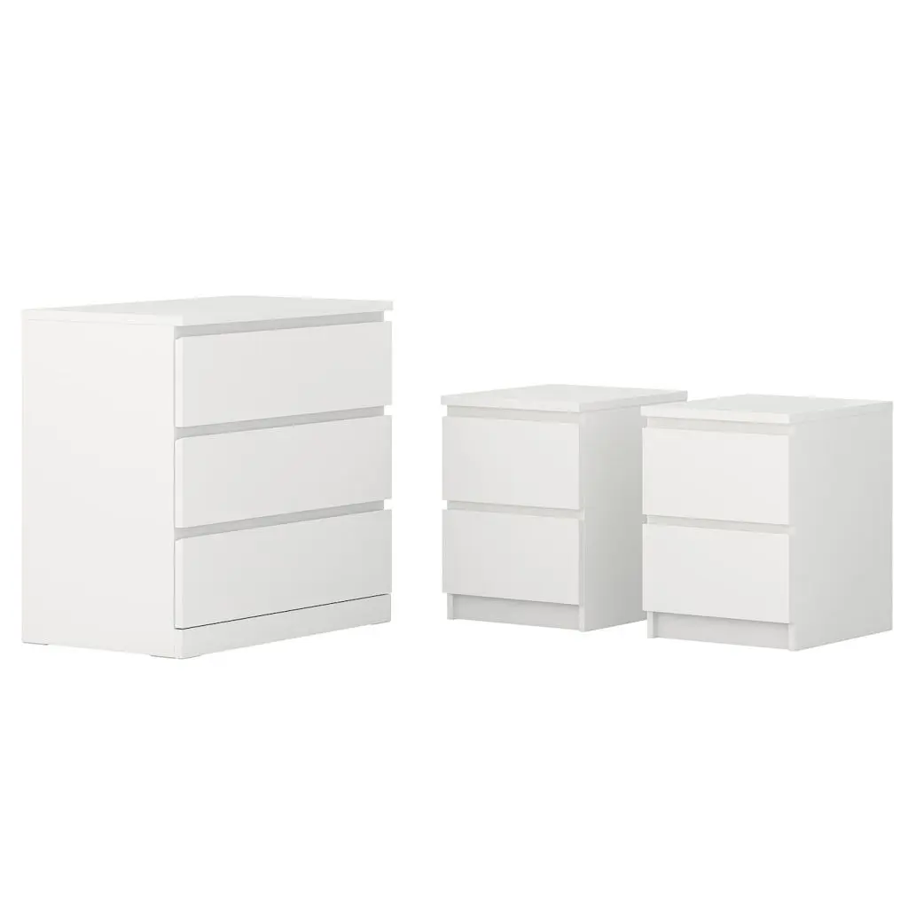 В комплект: 2 комода с 2 ящиками и 1 комод с 3 ящиками.