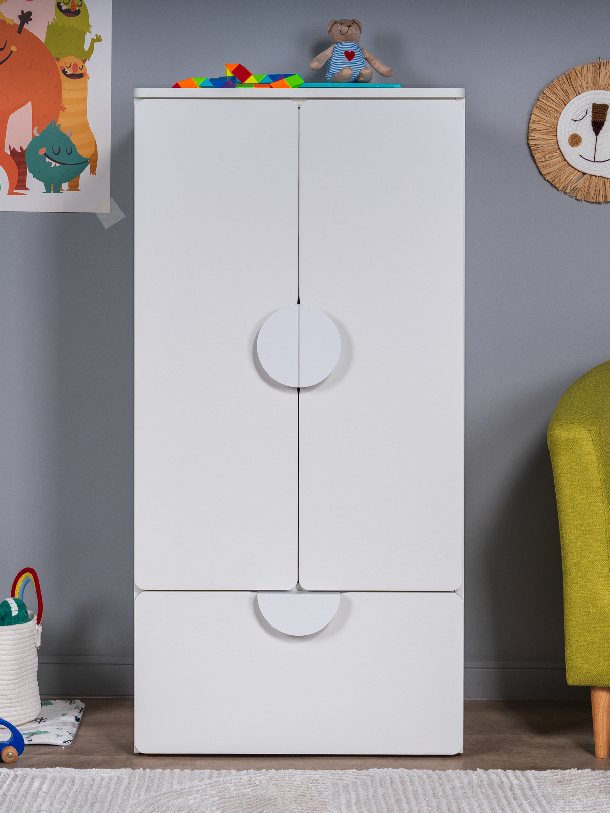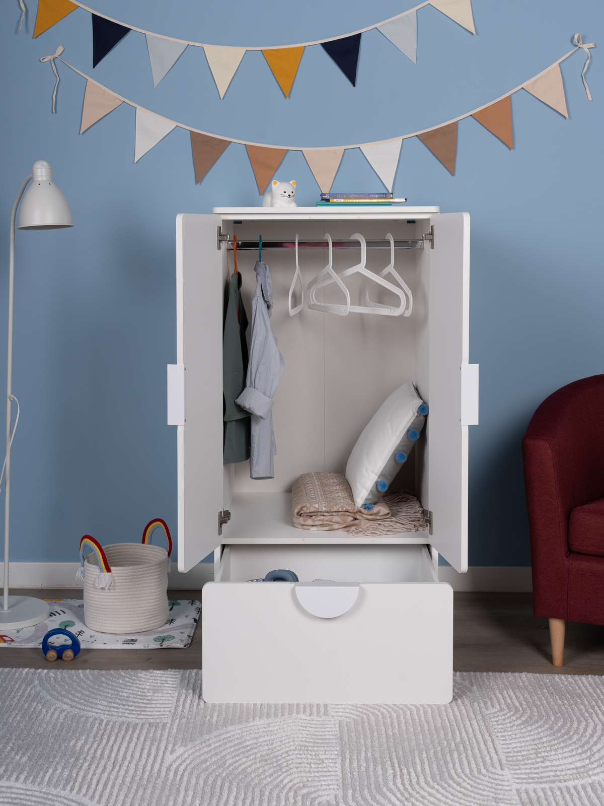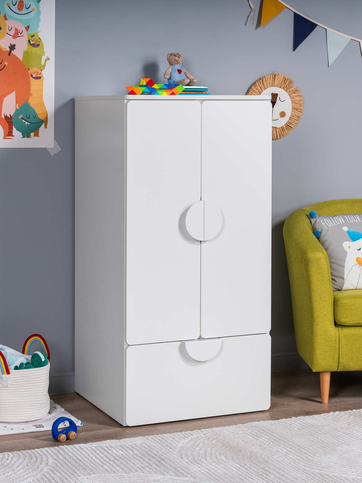 Шкаф распашной Пикси с 2 дверьми, полкой и ящиком, габаритный размер 60х57х123, цвет белый. Изготовлена из ДСП, окраска с УФ-лаком. Гарантийный срок 24 мес.