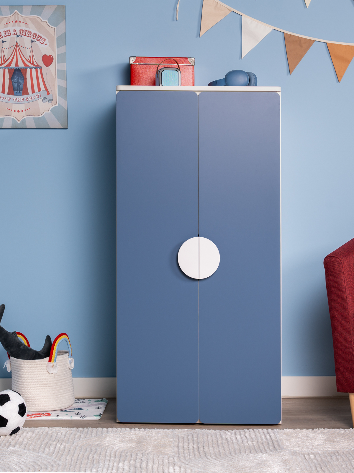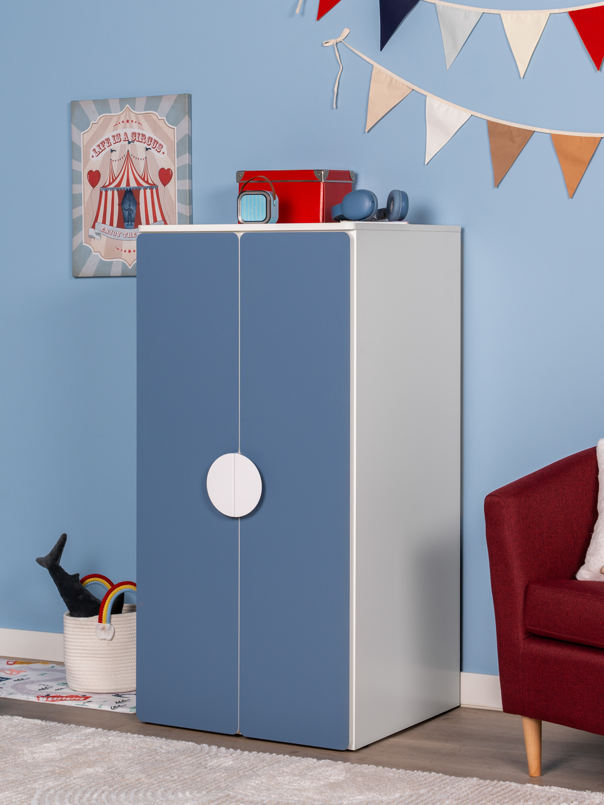 Шкаф распашной Пикси с 2 дверьми и полкой, габаритный размер 60х57х123, цвет серо-синий. Изготовлена из ДСП, окраска с УФ-лаком. Гарантийный срок 24
